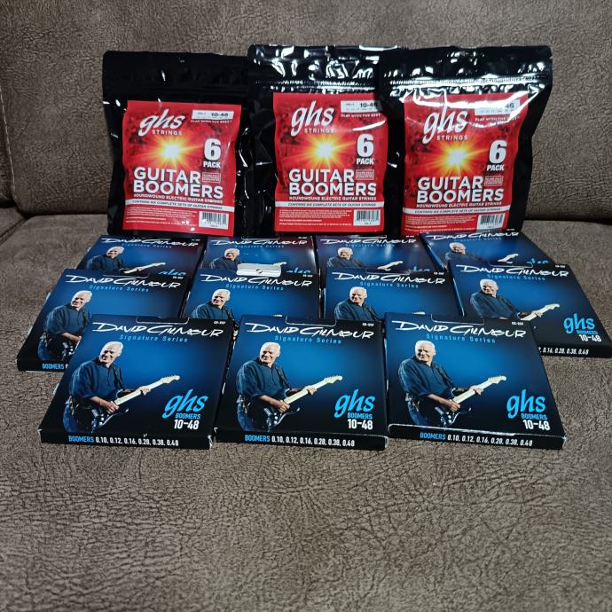 Prodajem 18 kompleta 10-46 GHS boomers žica (3 sixpacka) i 11 kompleta GHS David Gilmour žica. Naravno, nekorišteno i tvornički zapakirano. Cijena svega skupa je 80 eura, pošto ih ne prodajem odvojeno.