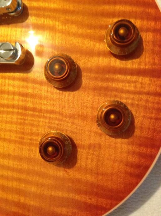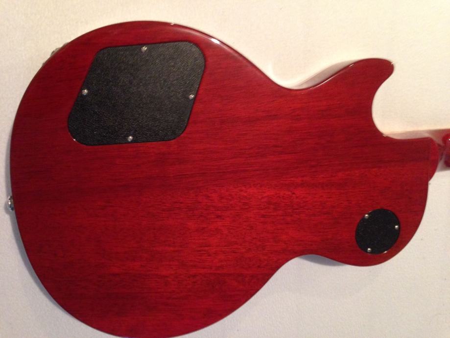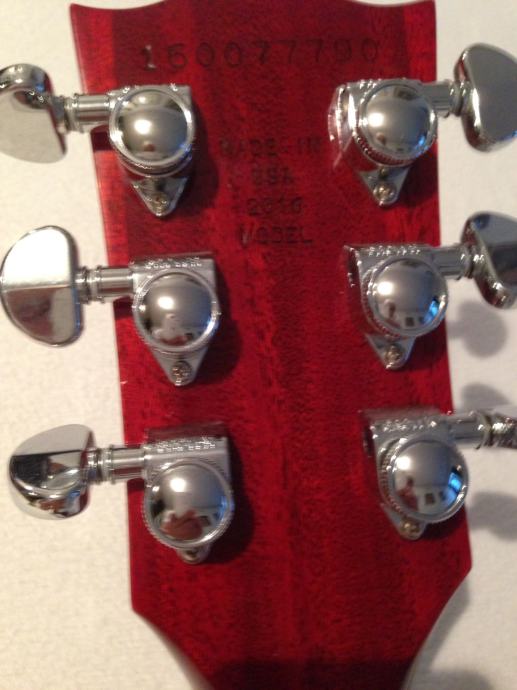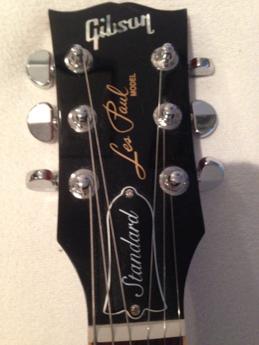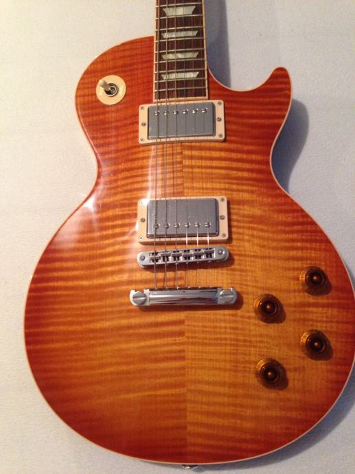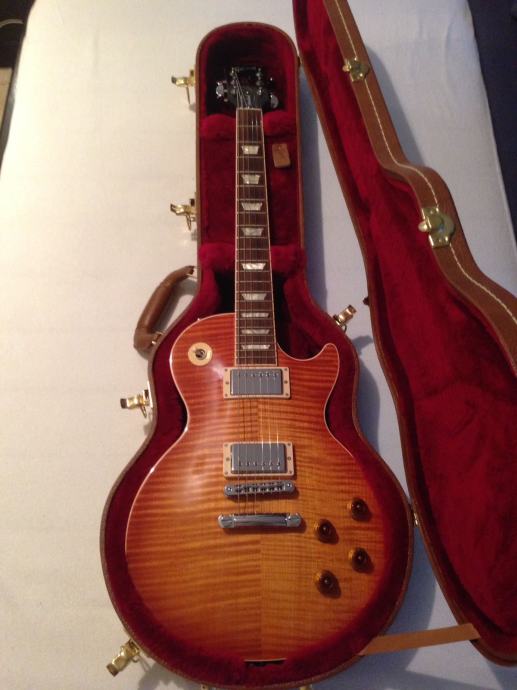 Električna gitara, tijelo mahagonij, prednja ploha javor, vrat mahagonij, pristohvat polisander, 2 humbucker pickupa, pripadajući kofer, Gibson multi-tool i polirajuća kripca. Boja je mislim Light Burst.
