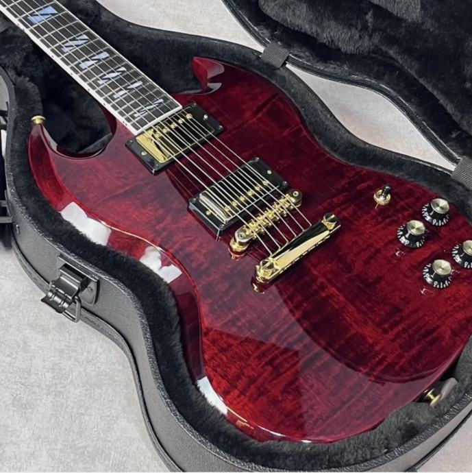 Gibson is excited to announce the return of the SG™ Supreme. With a refreshed feature set, it is bound to overshadow everything else in sight and be one of the most exciting new releases of the year. It features a beautiful AAA-figured maple top on a mahogany body. The mahogany neck has an ebony fretboard with a compound radius, 24 medium jumbo frets, and Super Split Block mother-of-pearl inlays. The headstock is adorned with a striking new mother-of-pearl "Chandelier Inlay" inspired by a design from the 1940s that was discovered in the Gibson archives. The Burstbucker™ Pro and Burstbucker Pro + pickups are paired with push/pull volume controls for coil tapping, along with individual tone controls. The three beautiful finishes are elegantly highlighted with gold hardware, making this not only a great-sounding and highly flexible instrument but also an exceptionally beautiful-looking modern rock machine. A hardshell case is also included.