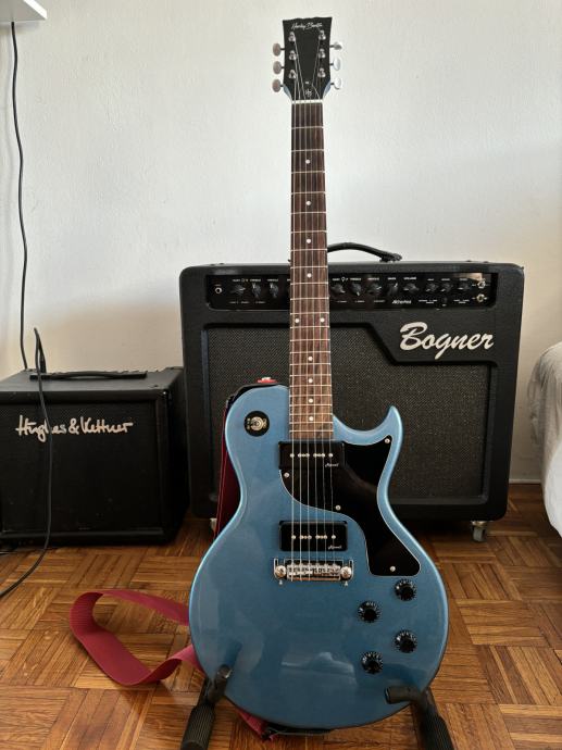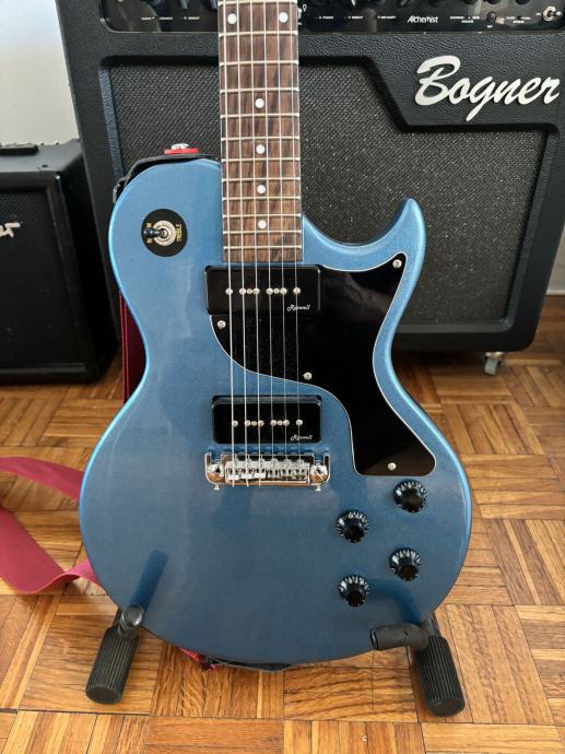 Super gitarica za smiješne novce. Lagana, svirljiva i iznenađujuće dobri P-90 pickupovi. Prekrasno izgleda plava metalik boja.