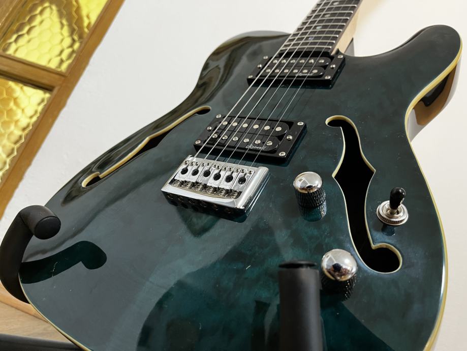 Semi-hollow dizajn, mahagonij tijelo, javor vrat radijusa 350 mm.