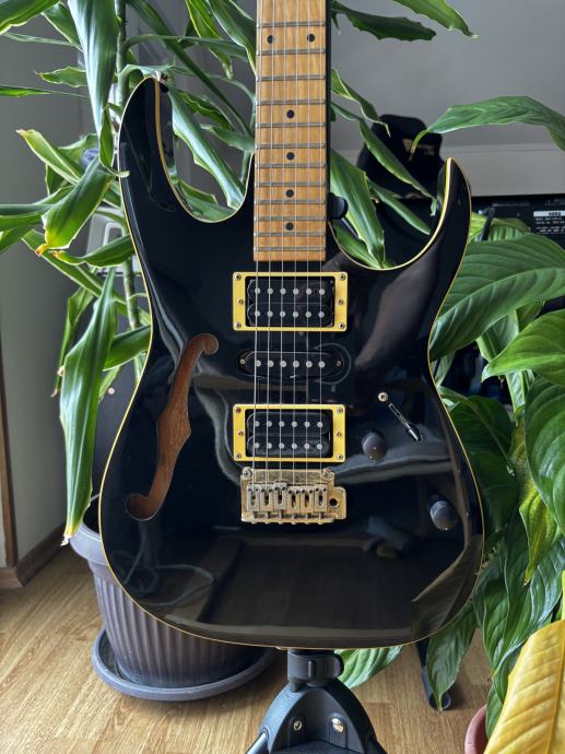 Prema prvom vlasniku (od kojeg sam ju kupio), ova gitara (MIK) je 1993. kupljena u Americi. Zanimljiva je po više stvari, tijelo je Chambered Light American Maple sa jednim F-hole izrezom, drvo kojeg nisam baš vidio da Ibanez koristi inače. Ima EX100 profil vrata (19.5mm debljina na prvom polju, 21.5 na 12. - https://ibanez.fandom.com/wiki/List_of_neck_types#EX100 ), 16" radius, 22 Jumbo praga, Powersound HSH kombinacija, zlatni hardware, cream binding. Htio sam za nju napraviti recenziju za Youtube jer sam vidio da nema nijedna, ali od svega ne stignem, a trebam smanjiti broj gitara.