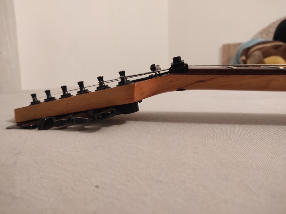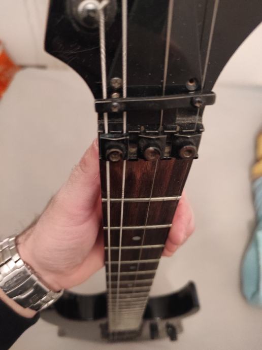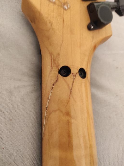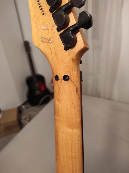 Prodaja moguca u kompletu ili u dijelovima, vidljiva ostecenja tijela i vrata na slici. Vrat je ravan i sipka (rod) drzi iako je reparirano. Pragovi su relativno potroseni na mjestima. Most je ok, izmjesana sedla, nema whammy bar.