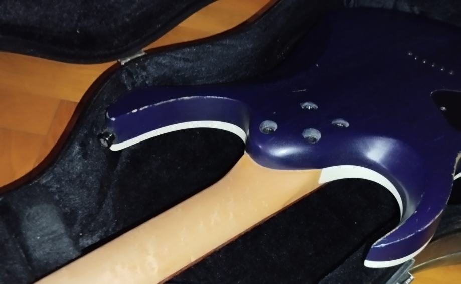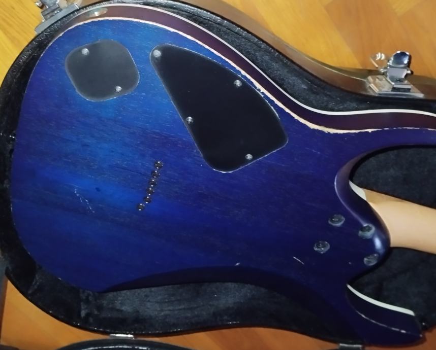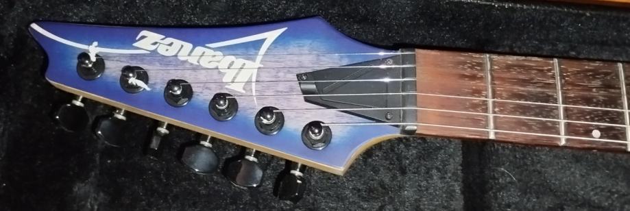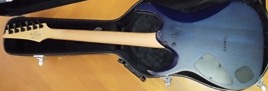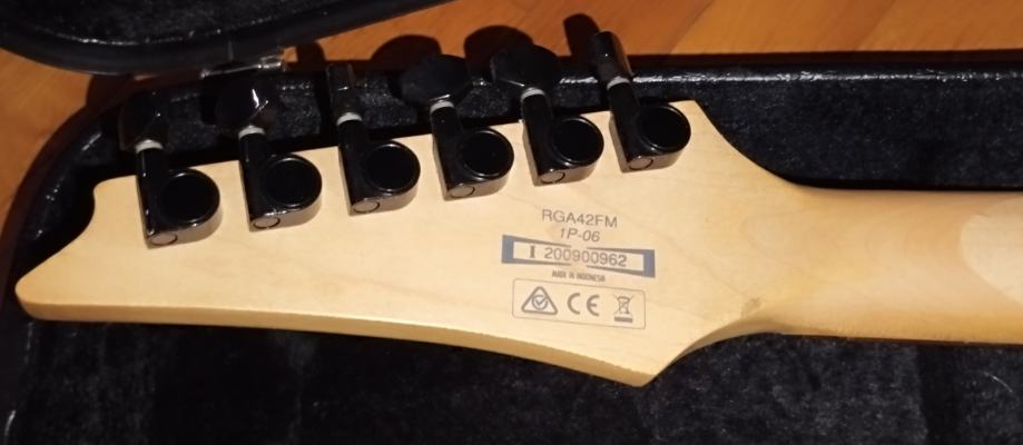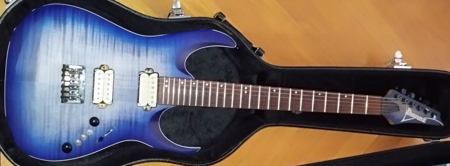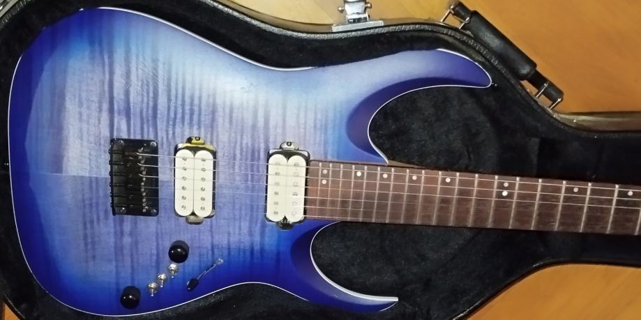 Ibanez RGA42FM - Neck Wizard III maple, Flamed Maple top/meranti body, DiMarzio Illuminator neck i DiMarzio d-Activator bridge pickup. Dodana 3 mini switcha, po 1 za split svakog humbuckera i treći (srednji) za killswitch, 5-way switch, master volume i master tone. Made in Indonesia. Gitara je tvornički straga bojana, bez laka, pa se boja na rubovima skinula tijekom korištenja. Sve ostalo u izvrsnom stanju. Prodaje se bez kufera, s futrolom.