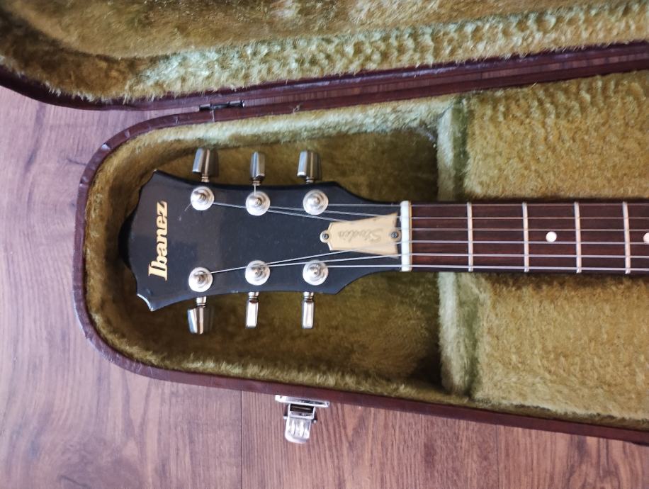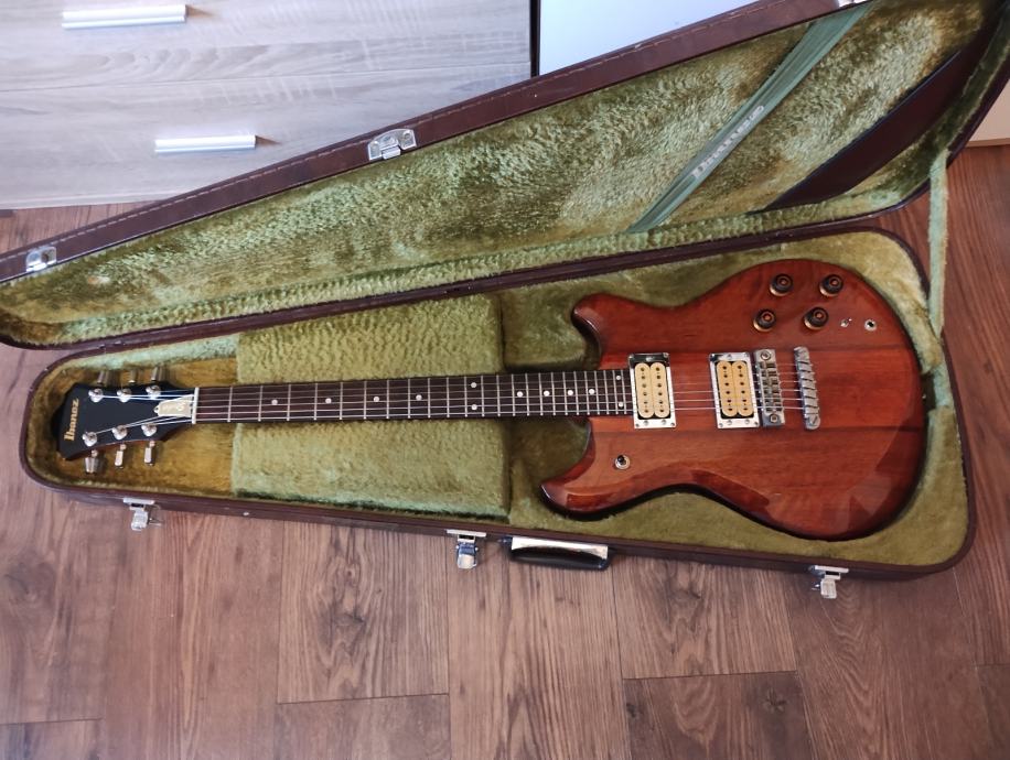 Odlicna gitara Japanske proizvodnje, mislim da je 105 oznaka modela (nije jeftiniji model) jer je inace oznaceno na poklpcu truss rod-a a na ovom, zlatne boje je oznaka samo Studio( mozda neka osobita serija). U gitaru je dosta novaca ulozeno za povratak u autenticno stanje. Cak i okviri su nabavljeni original Ibanez iz tog doba, prepoznatljivi s tri rupe, za V2. Na originalne cream je prijasnji vlasnik montirao humbackere s 4 rupe. Idu i oni s gitarom.