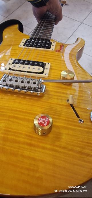 santana yellow semihollow, zamjenjen standardni neck magnet za vrhunski q pickups locking tuneri gotoh poboljšana elektronika setupirana niska akcija elixir 1.0 žice, torba, stanje ko nova