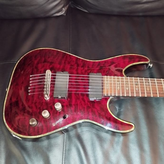 Schecter Hellraiser C-7 - Schecter locking tuners, Rosewood fretboard, Mahogany Body, Graph Tech XL Black Tusq nut, TonePros 7-String TOM w/ String Thru Body Bridge, Inlays: Abalone Gothic Crosses, Volume (Push-Pull)/Volume (Push-Pull)/Tone/3-Way Switch, Pickups: EMG 707TW, Made in South Korea. Originalni Schecter kufer.
