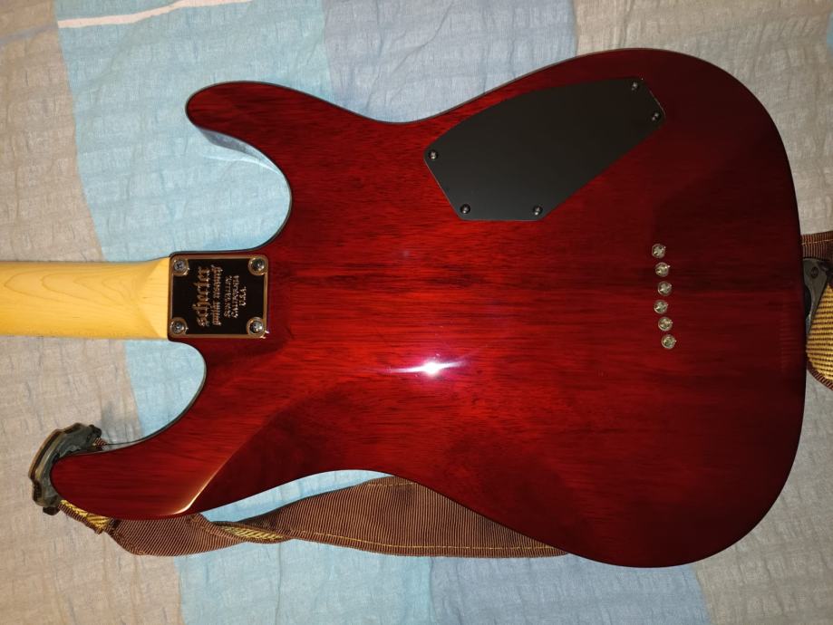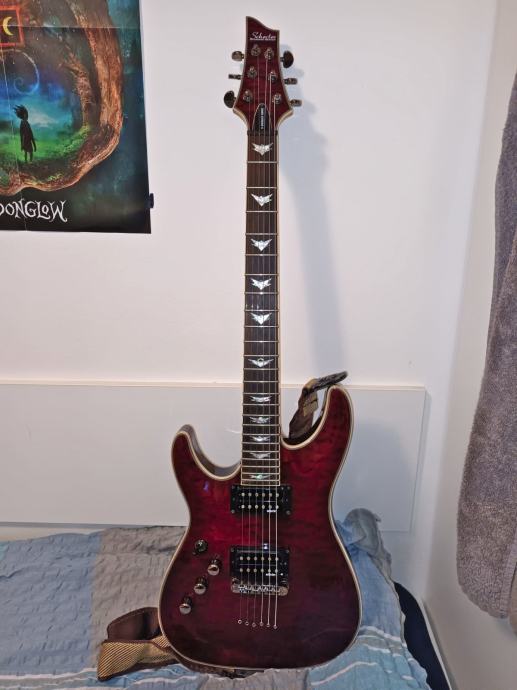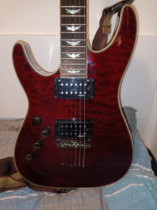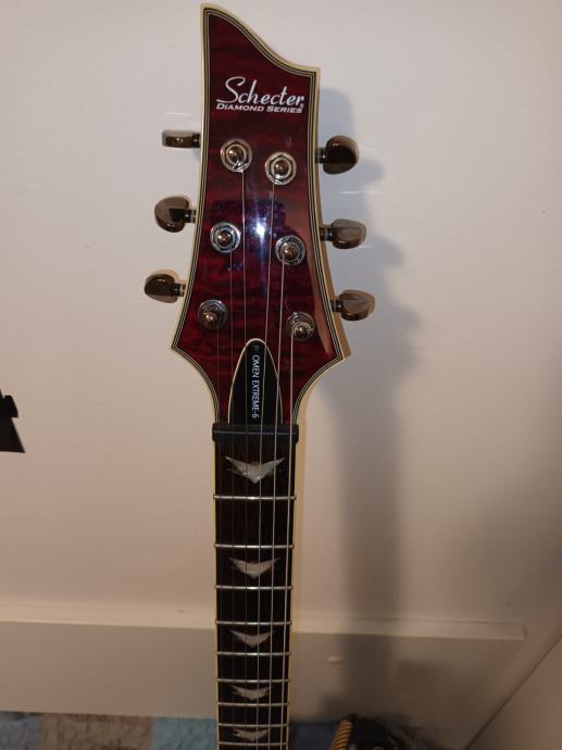 Schecter Omen Extreme 6 BCH LH za ljevoruke left lefty, lefthand electric guitar, mahagony body, quilted maple top, maple neck, thin c neck shape, rosewood fretboard (Dalbergia latifolia), 24 XJ frets, 42mm nut width, 648mm scale, 2 Schecter Diamond Plus humbuckers, 2x volume control, 1x tone control, 3-way toggle switch, black chrome hardware, finish: black cherry