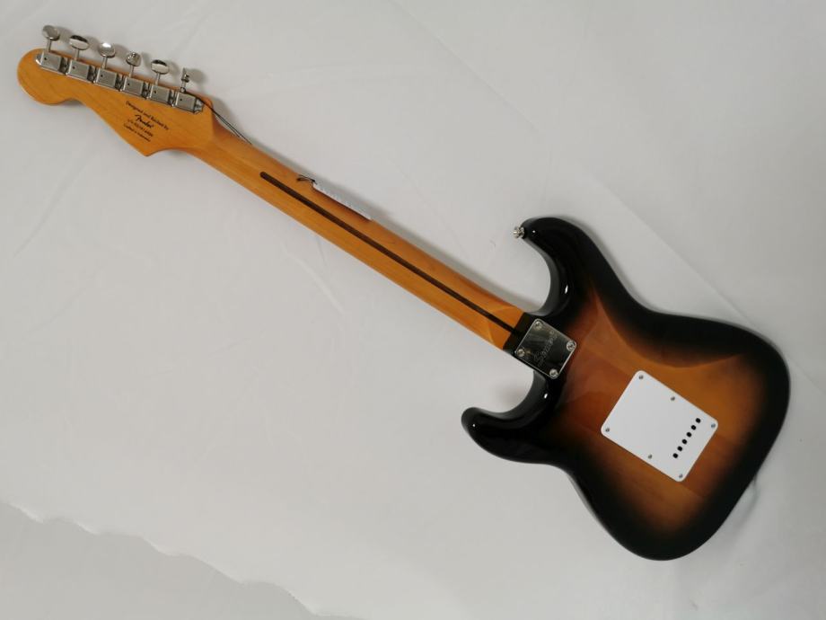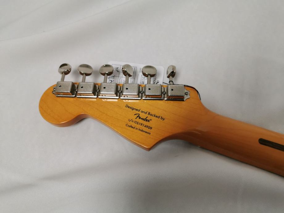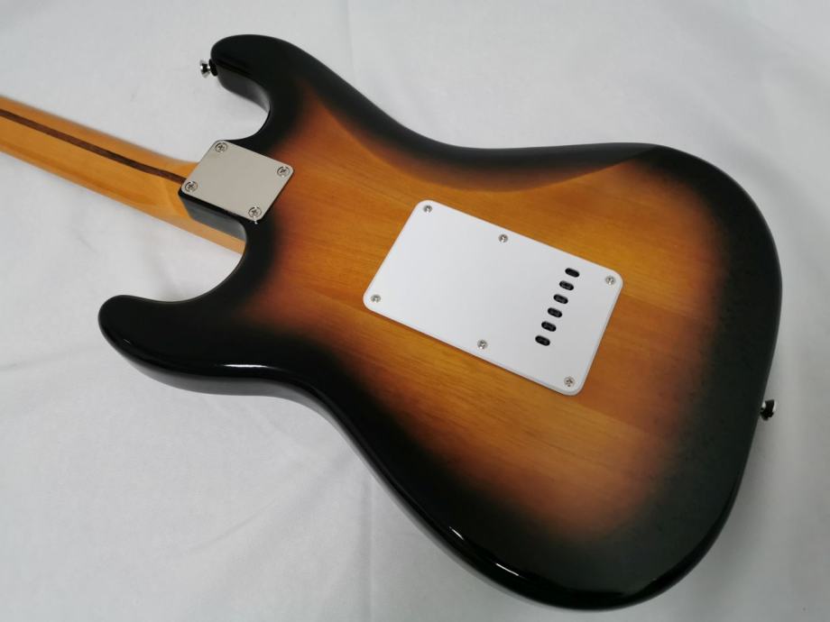 Maple neck, 2-Color Sunburst; Body: Pine; Neck profile: C; 21 Narrow Tall frets; Bone nut; Fretboard radius: 241 mm (9.49"); Pickups: 3 Fender-designed Alnico single coils; single layer white pickguard; 6-Saddle vintage-style synchronised tremolo; Vintage style machine heads.