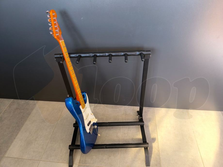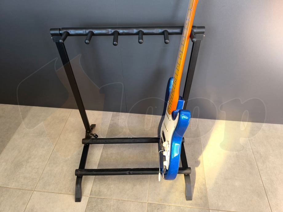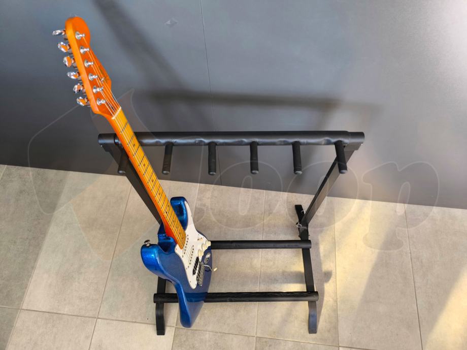 univerzalni stalak za 5 gitara ili slične glazbene instrumente. Čvrsta i kvalitetna konstrukcija, mogućnost sklapanja kako bi tijekom transporta zauzimao manje prostora, dijelovi koji drže instrumente obloženi su sa spužvom. Stalak idealan za električne, akustične i bas gitare.