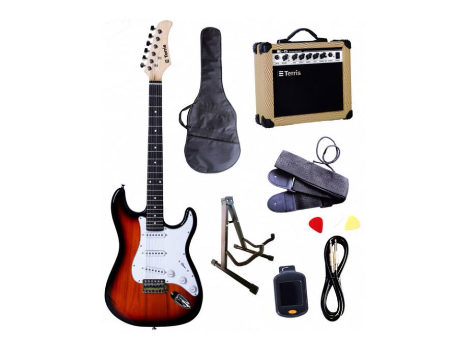Komplet za električnu gitaru koji sadrži električnu gitaru, pojačalo, kabel, remen za gitaru, torbu za gitaru, štimer i stalak za gitaru.