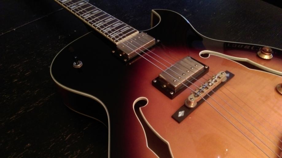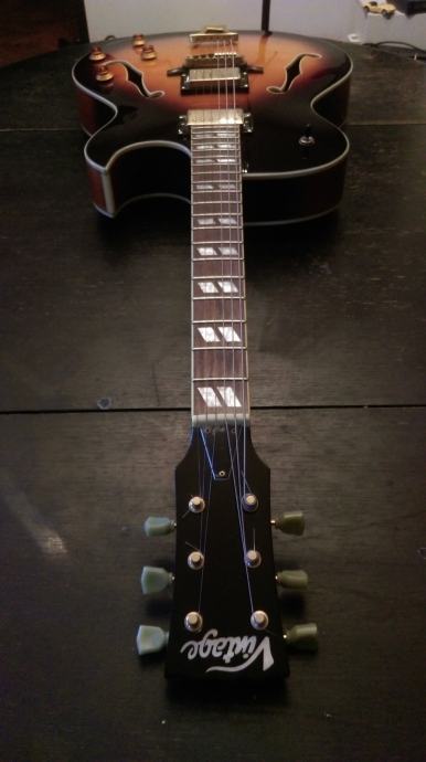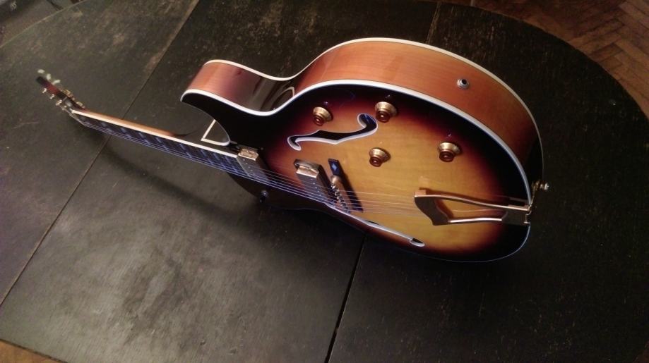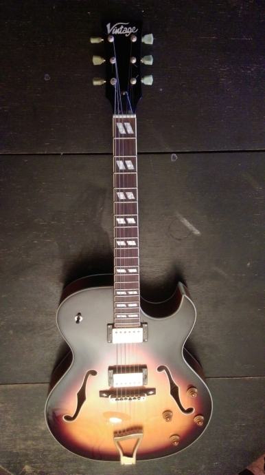 Prodajem jazz (archtop) gitaru marke Vintage. Ima snažan akustični zvuk, pa čak i na suho može zvučati kao da je uključena u pojačalo. Kad se ukopča, kao i većina archtop gitara, nudi topao zvuk prikladan za jazz i blues.