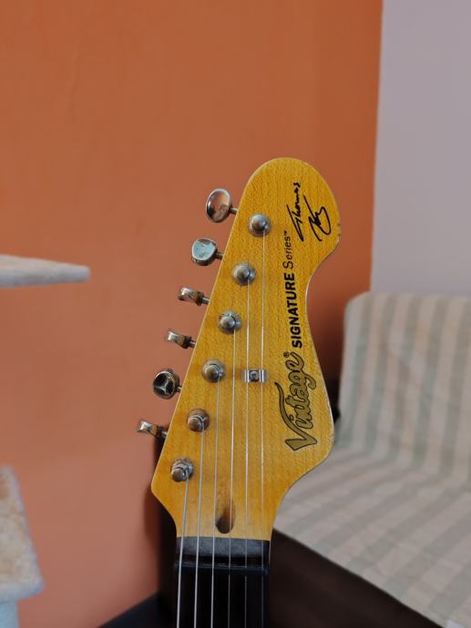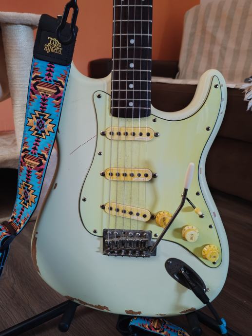 Alder body, Hard Maple neck (soft 'C' profile), and a 7.5-inch radius Rosewood fingerboard with 21 medium frets. It is equipped with custom Wilkinson electronics (3x WVS single coils) and hardware, including a "Bukka" switch (push/push tone pot) for hum-canceling.