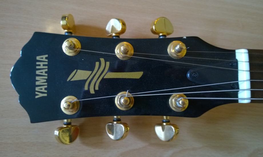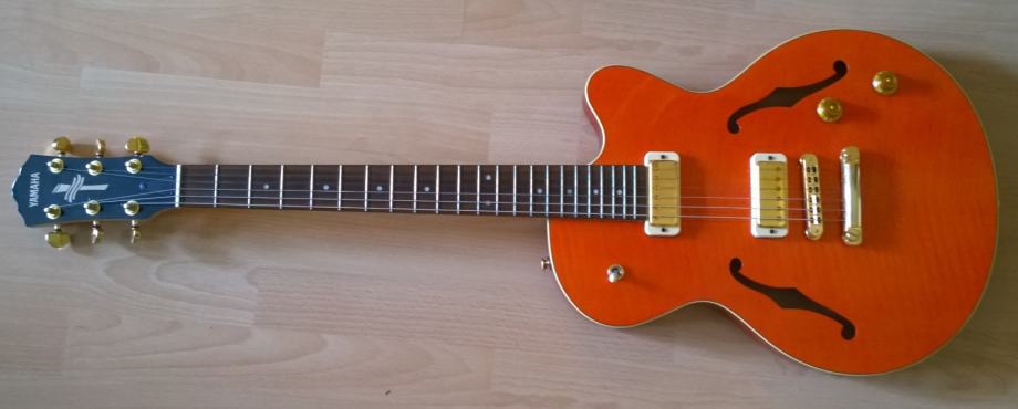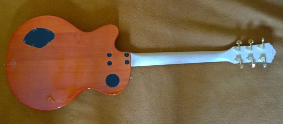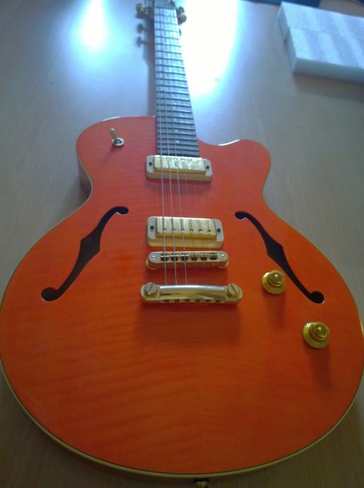 Semi hollow body električna gitara s dva mini humbuckera, zlatni hardware, narančasti ("orange stain") finiš (flametop od javora, tijelo od johe).
