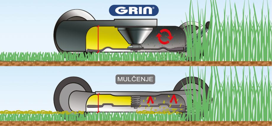 Z Grinom trave ni treba zbirati, skladiščiti in odlagati. Pokošena trava ostane v notranjosti patentirane kosišča Grin. Centrifugira se in zdrobi v prah, zahvaljujoč vrtincu, ki ga ustvari patentirano Grin rezilo v kombinaciji z učinkom Grin helix diska. Na ta način trava izgubi večino svoje prostornine in se zdrobi v majhne in skoraj nevidne delce. Ti delci padejo neposredno na tla (ne ostanejo na površini trate!) in se absorbirajo v zelo kratkem času. GRIN optimalno predela travo v notranjosti kosilne enote in jo zmelje v izjemno drobne delce, ki postanejo odlično gnojilo za vašo trato! V normalnih razmerah je trata videti identična tisti, ki jo pokosite s kosilnico z košem za travo. Vse kosilnice Grin so izdelane s posebnim okvirjem, ki je zasnovan izključno za to vrsto košnje.