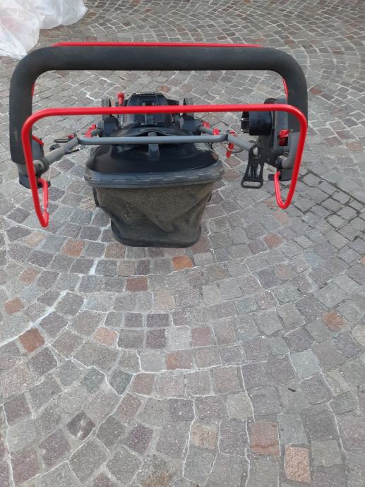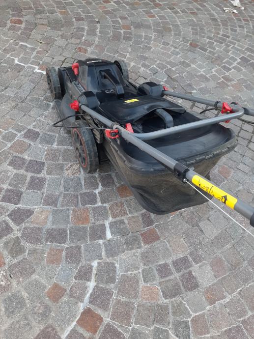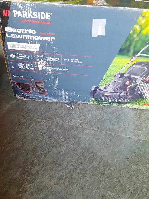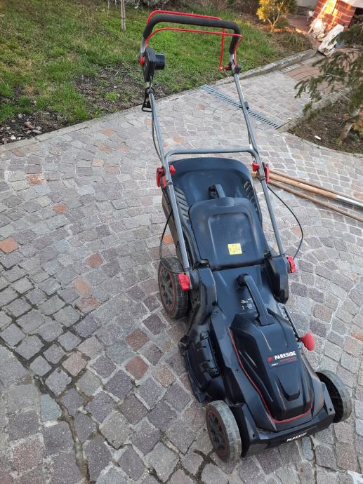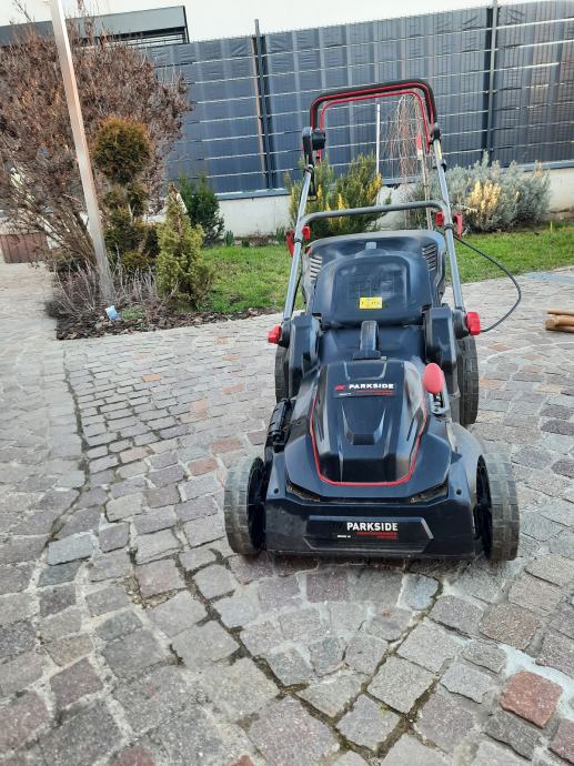 Parkside el. Kosilica 2000 w turbo motor, samohodna, malo koristena.Promjer košnje 46 cm, kosara 60 l, može bacati travu i bočno. Šalter za upaliti malo šteka i treba ga drzati dok se kosi.