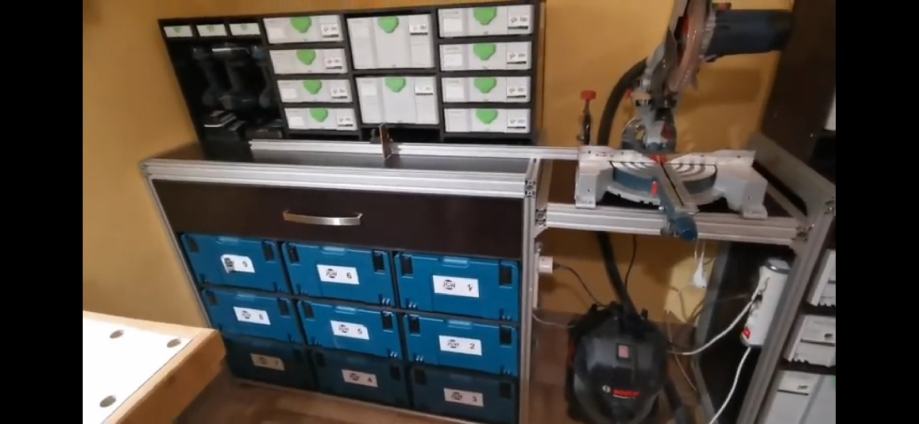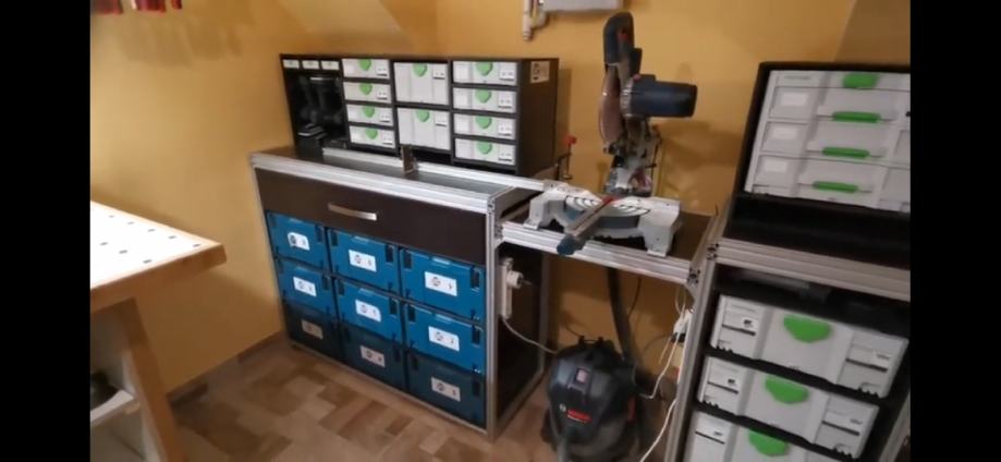 Potezna pila Bosch Gcm 800SJ Professional sa postoljem izrađenim od aluminijskih profila. Ugrađena ladica i mnogo skladišnog prostora. Koferi nisu u cijeni.