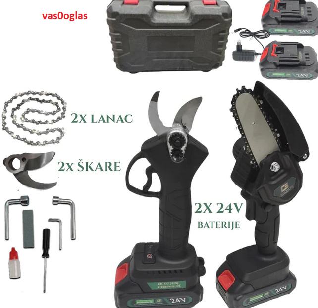 Paket uključuje: aku pilu,aku škare , 2x bateriju24v , 1x punjač, 2x ključevi,1x mač ,2x lanac 12cm , 1x oštrač - 2x škare-1x kofera , 1 x brzi punjac