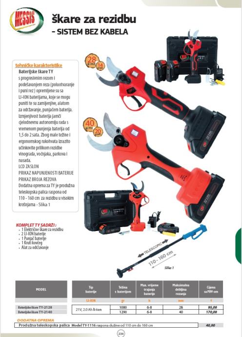 puniti te su zamijenjive, alatom za održavanje, punjačem baterija. Izmjenjivost baterija jamči cjelodnevnu autonomiju rada s vremenom punjenja baterija od 1,5 do 2 sata. Zbog male težine i ergonomskog rukohvata izrazito učinkovite prilikom rezidbe vinograda, voćnjaka, parkova i nasada.