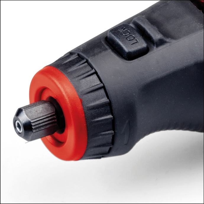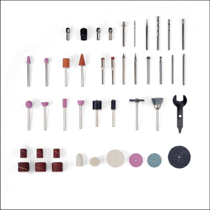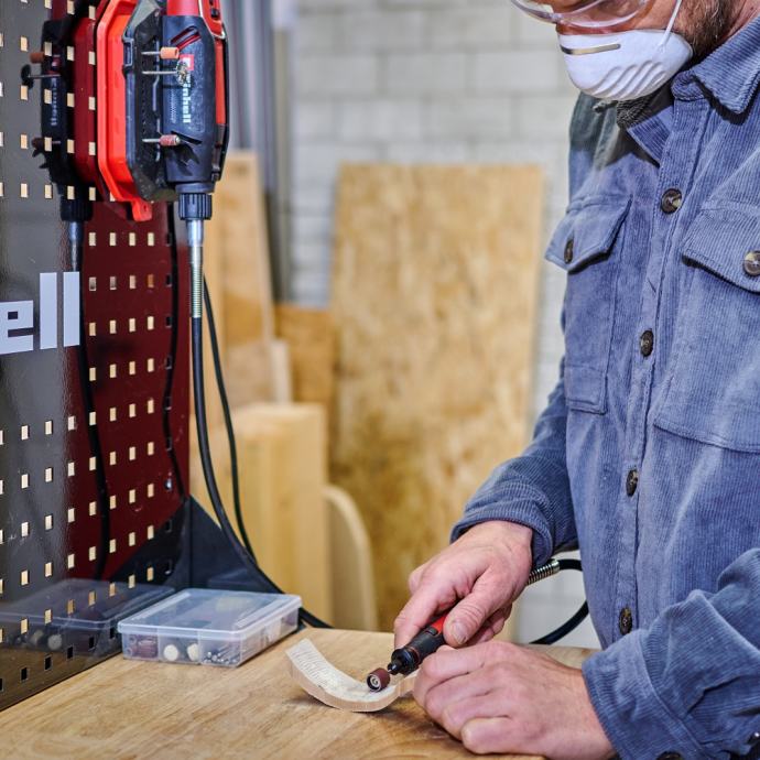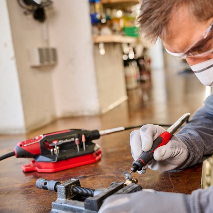 Einhell alat za brušenje i graviranje TC-MT 150 E svestran je suputnik za širok raspon poslova, uključujući graviranje, poliranje, glodanje, brušenje, rezanje i četkanje. Sa 6-stupanjskom elektronikom brzine, performanse se mogu fleksibilno prilagoditi materijalu i odgovarajućoj primjeni, s mogućim brzinama od 10.000 do 35.000 okretaja u minuti. Blokada osovine omogućuje laku i brzu promjenu alata. Precizni rezultati, čak i za detaljne zadatke ili složene gravure, omogućeni su nastavkom na 10 cm dugoj, fleksibilnoj osovini. Nastavak za graviranje savršeno leži u ruci zahvaljujući svom tankom dizajnu s mekim površinama za držanje. Priloženi držač uređaja ima praktično spremište za osovinu i nastavak, kao i držač za pribor za često korištene dodatke. Alat za brušenje i graviranje može se prema potrebi objesiti na zid zahvaljujući držaču uređaja ili sigurno postaviti na radni stol zahvaljujući gumiranim nožicama. Za uredno pohranjivanje, praktično spremište za kabel integrirano je u držač uređaja. Opseg isporuke uključuje opsežan set pribora od 117 nastavaka, koji nudi gotovo neograničene mogućnosti korištenja za široku paletu zadataka.