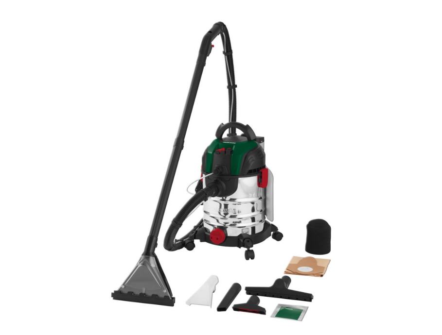 Pribor: 1 mlaznica za pranje za čišćenje presvlaka, 1 mlaznica za pranje s nastavkom za tvrdu površinu, 1 mlaznica za pod, 1 mlaznica za presvlake, 1 mlaznica za pukotine, 2 usisne cijevi (495 mm svaka), 1 pjenasti filtar (mokro usisavanje), 1 papirna filtar vrećica (suho usisavanje) i sredstvo za čišćenje tepiha i presvlaka 100 ml