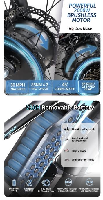 2000W T1000 PRO Electric Bike Dual Motor 26 inch Fat Tire Bike 48V 23Ah Mountain Ebike Removabel Battery Electric Bicycle