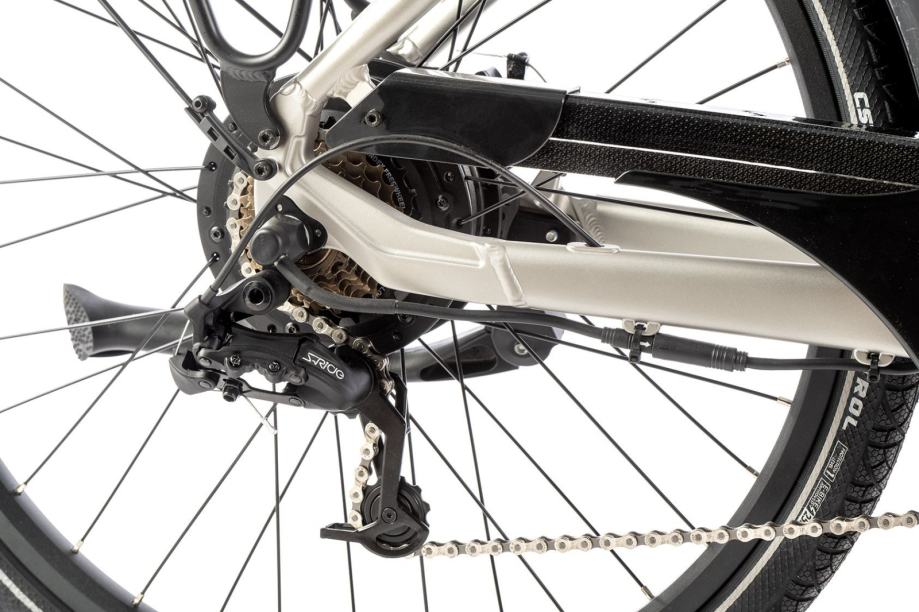 Opremljen je kvalitetnim stražnjim motorom BAFANG nominalne snage 250W, s maximalnom snagom 350W, novom snažnom baterijom SAMSUNG 15Ah (540 Wh) sa USB izlazom.