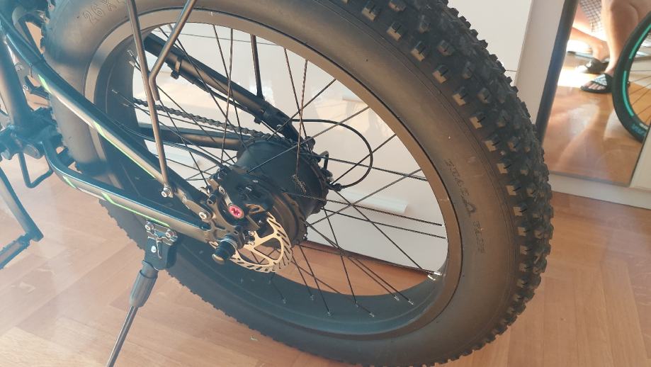 1000w motor, 12,8Ah baterija, dupla suspenzija, 26" fat gume. S njim dolaze ključevi, pumpa, alat i punjač.