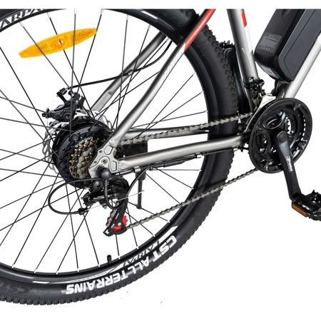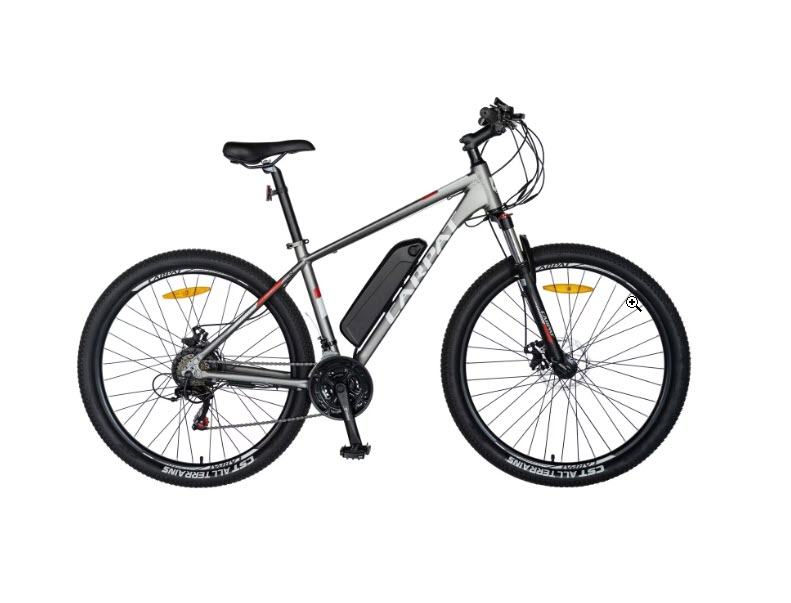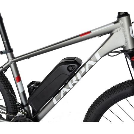 Na prodaju električni bicikl Carpat MTB C1011E, crni, kotači 27,5 inča, motor 250W, autonomija do 60 km, aluminijski okvir, mehaničke disk kočnice, crni dizajn.
