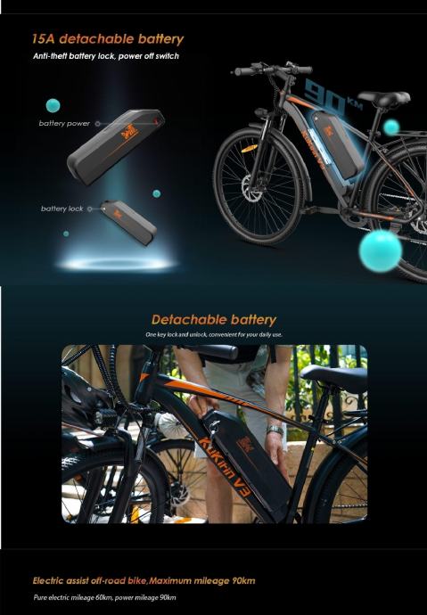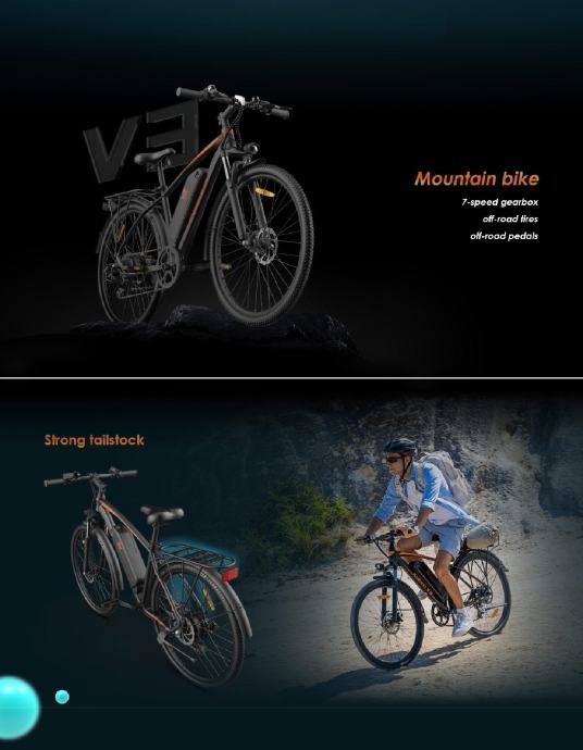 Tri moda vožnja : bez pedaliranja (gas na ručici volana) , pedaliranje uz pomoć motora i pedaliranje bez pomoći motora.