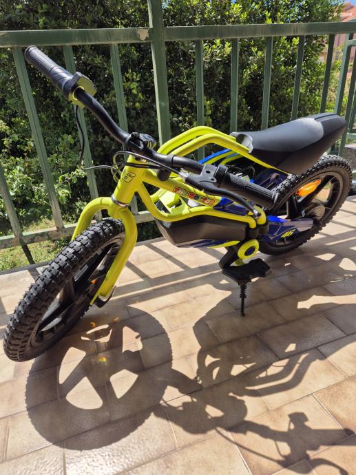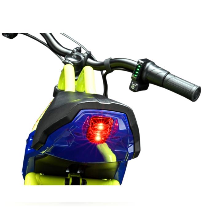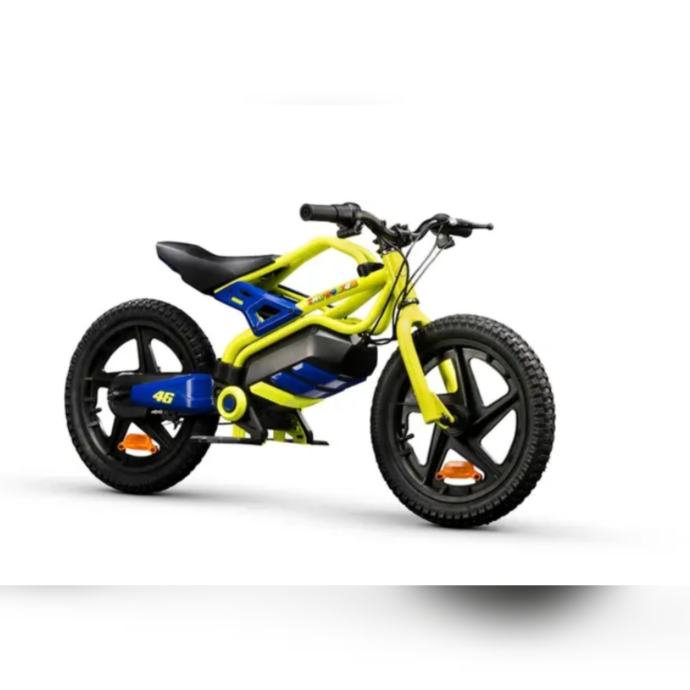 Električni bicikl VR46 KID MOTOR BIKE-X potiče razvoj koordinacije i ravnoteže. Okvir u fluorescentno žutoj i plavoj boji, inspiriran legendarnim motociklom broj 46 devetostrukog Moto GP prvaka, potiče mlade vozače na razvoj vještina. Gume veličine 16" smanjuju rizik od pada, osiguravajući istovremeno stabilnost i prianjanje na različite podloge.