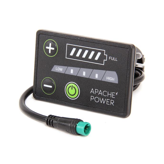 Setovi Apache Power BASIC / SILENT/ PLUS su opremljeni sa kvalitetnim Li-Ion (litij-ionska) baterijama sa člancima marke LG. Izlazni napon baterije je 36V i maksimalna struja pražnjenja do 15A (s prekidima do 18Ah). U ponudi imamo dvije vrste baterija – za ugradnju u nosaču baterije na stražnjem nosaču tereta ili na okviru bicikla ( baterija se ugrađuje na mjesto predviđeno za bocu). U setu za ugradnju baterije na nosačem tereta je nosač tereta uključen u setu.