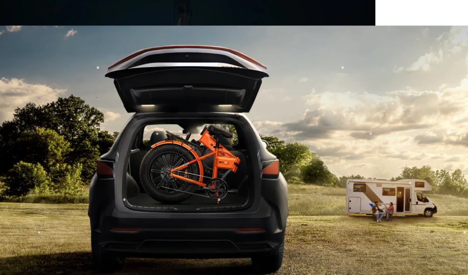 Baš kao što e-bicikl razvijen, može se jednako brzo ponovno preklopiti obrnutim redoslijedom. Zahvaljujući potpori, sklopljeni e-bicikl je stabilan na tlu bez dodira lančanika. Držač na okviru olakšava podizanje.