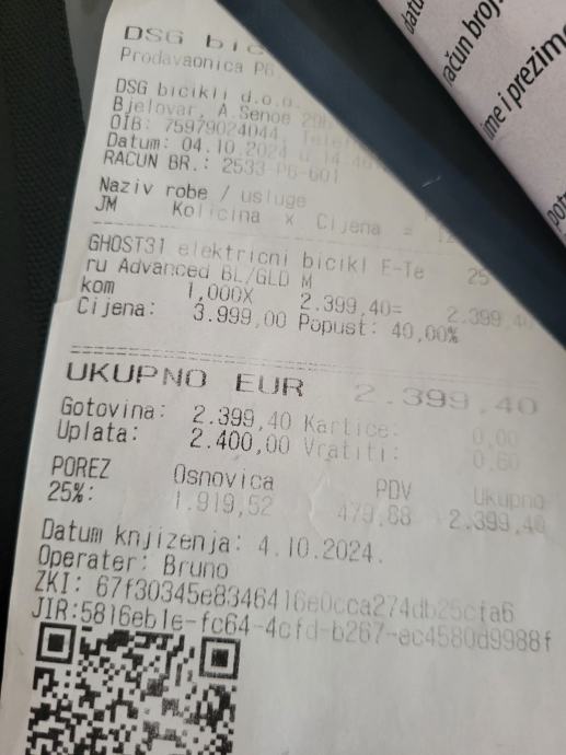 Kupljen je u DSG Bicikli s popustom na gotovinu što je vidljivo s računa.