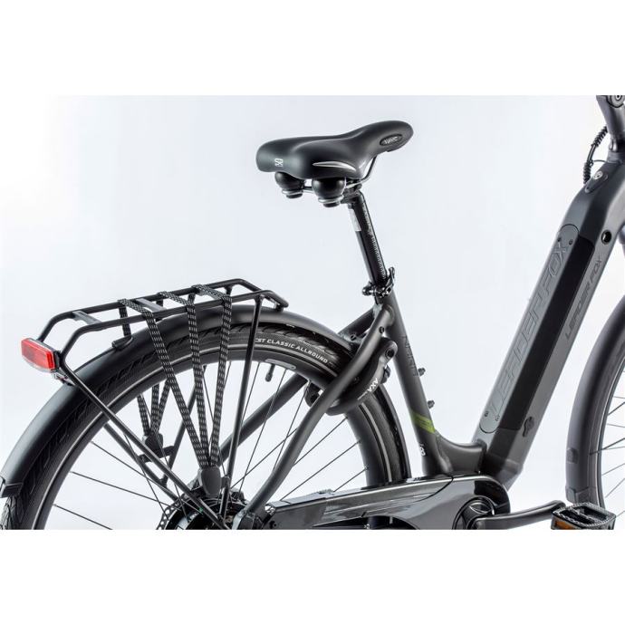 je kvalitetan gradski električni bicikl elegantnog dizajna sa stražnjim pogonom, aluminijskom ramom, opružnom prednjom vilicom, hidrauličnim disk kočnicama i kotačima dimenzija 28“