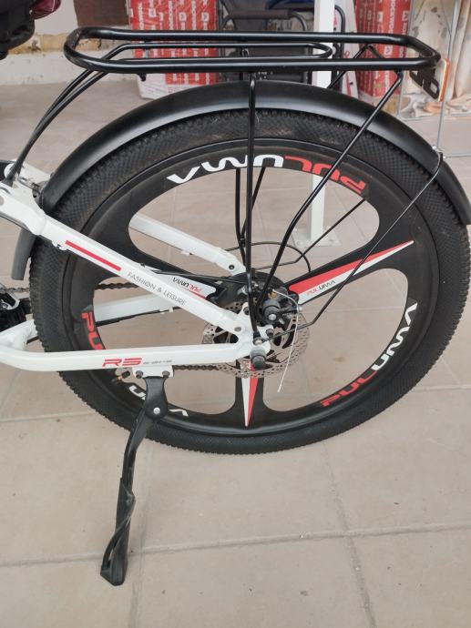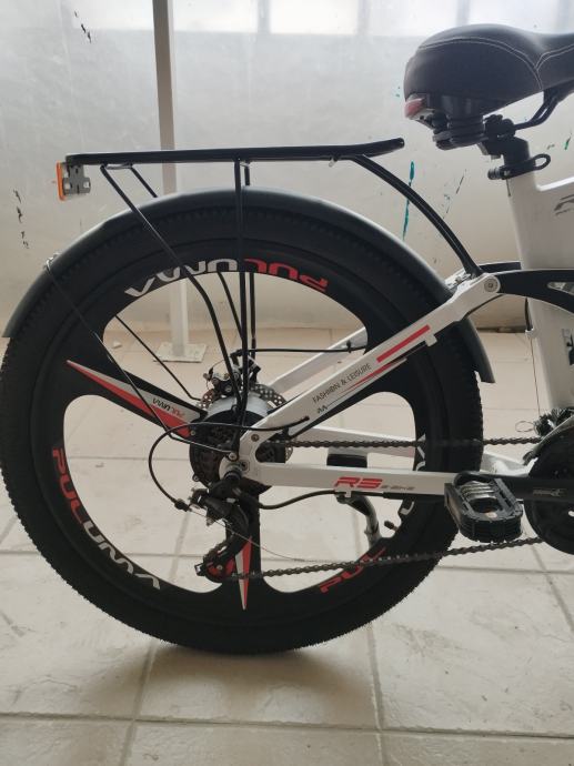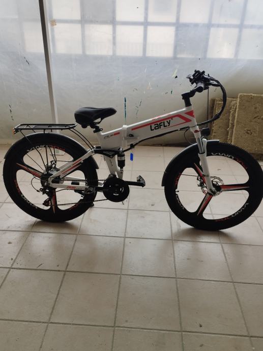NOVI el. bicikl, 17 Ah baterija, 1000 W motor, 26 inča. Nosivost 150 kg, Rama aluminijska legura. Brzine 3x7 Shimano. Baterija 17 LG proizvođač. Način rada: 1) Samo električni 2) Pedaliranje uz pomoć motora. Kočenje je hidraulično prednjim i stražnjim diskovima. Bicikl ima trubu, prednje i stražnje svjetlo, nosač mobitela, blatobrane, zadnji nosač za prtljagu ili torbe, sajlu za zaključavanje i zaštitu, te torbicu za sitnice. Težina je 25 kg. Jednostavno se preklapa, te stane u prtljažnik auta.