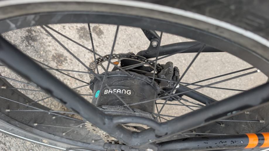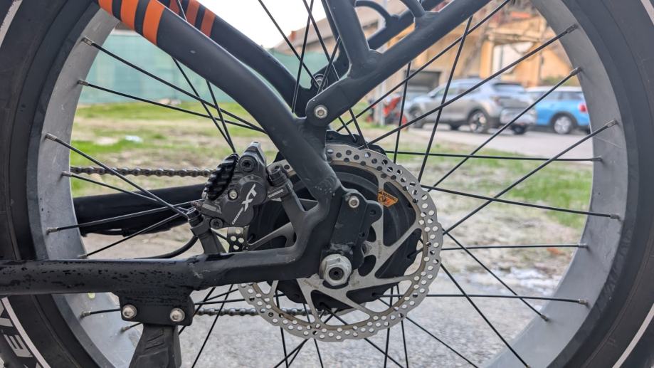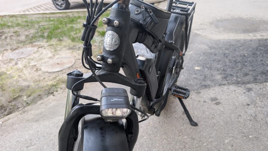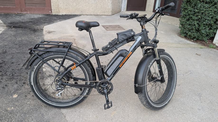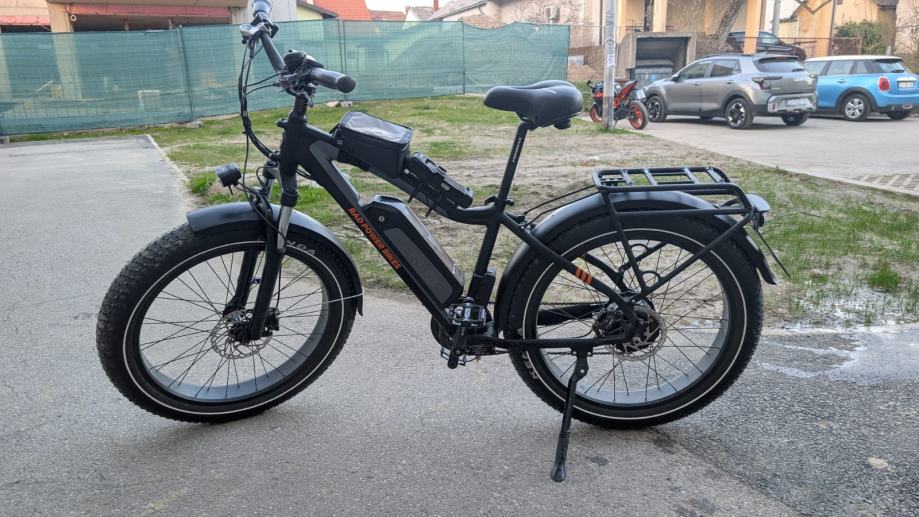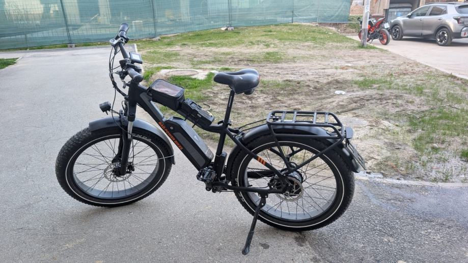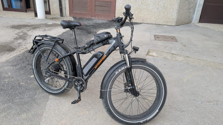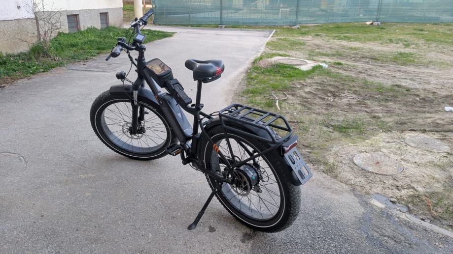 Prodajem rabljeni električni bicikl RadRhino u crnoj boji. Radi se o fat bike modelu s debelim gumama, opremljenom prtljažnikom, blatobranima i motorom snage 0,75 kW. Maksimalna dopuštena brzina je 25 km/h, a nosivost do 120 kg.