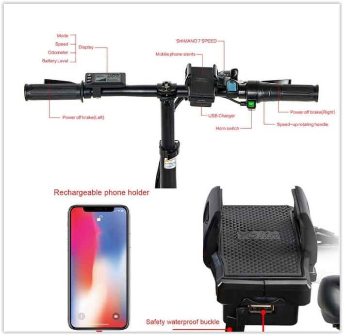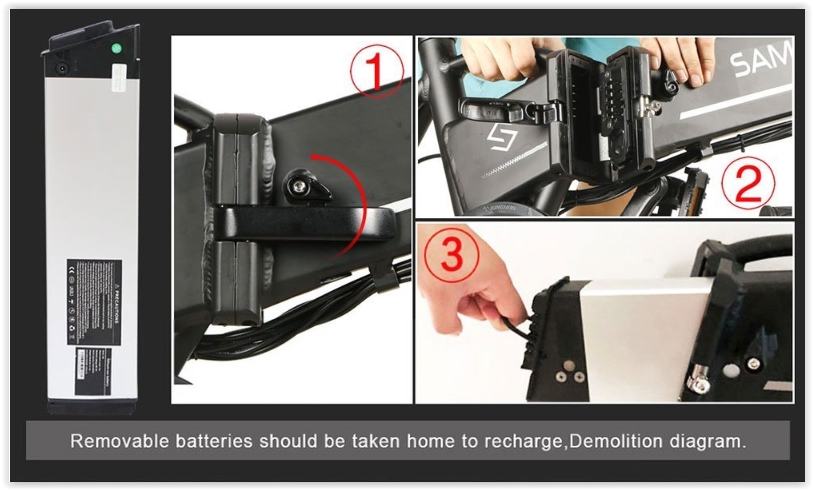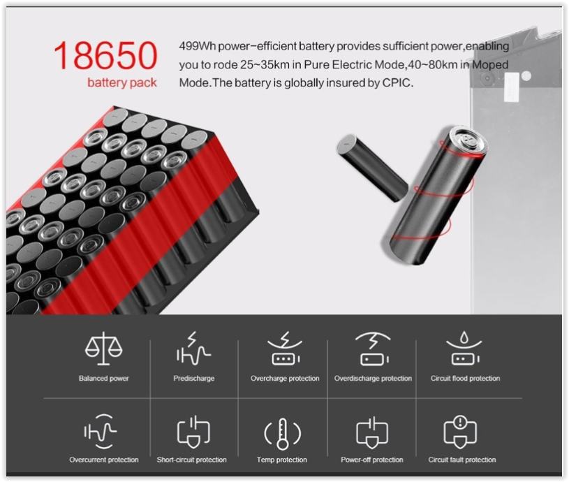 ● 10.4Ah / 48V Li-ion baterija ( ukčljučena u isporuku ) za max 40km udaljenost u čistom električnom modu i 70km udaljenost u modu gdje električni motor pomaže u vožnji