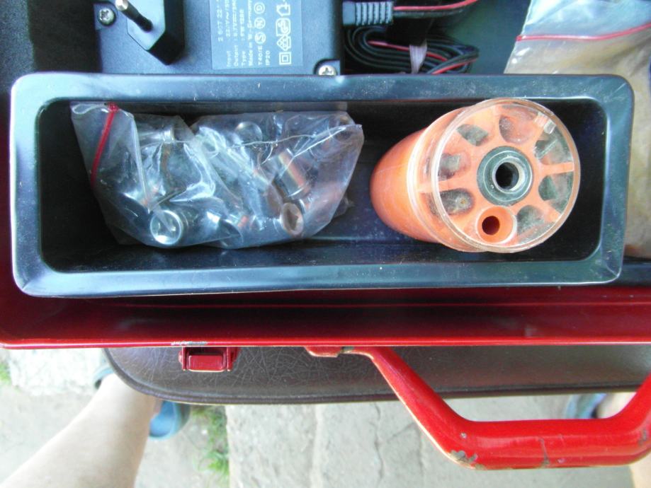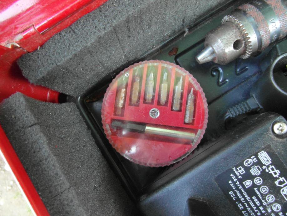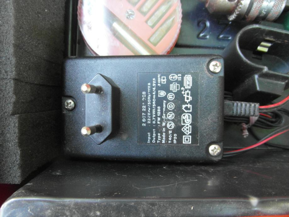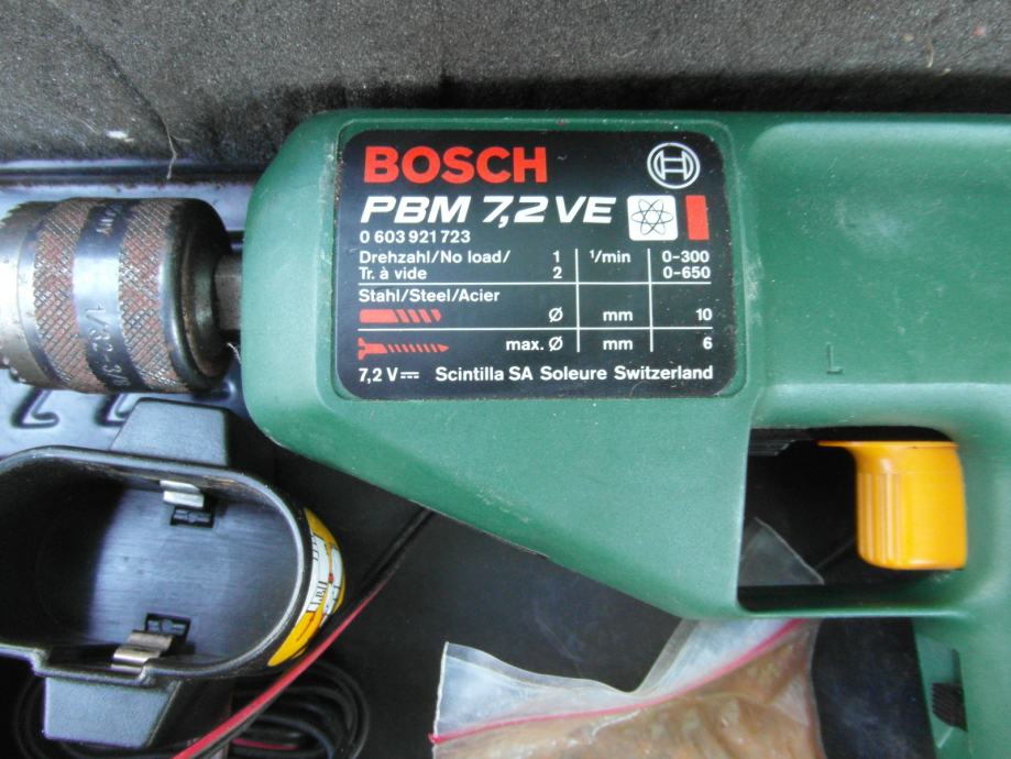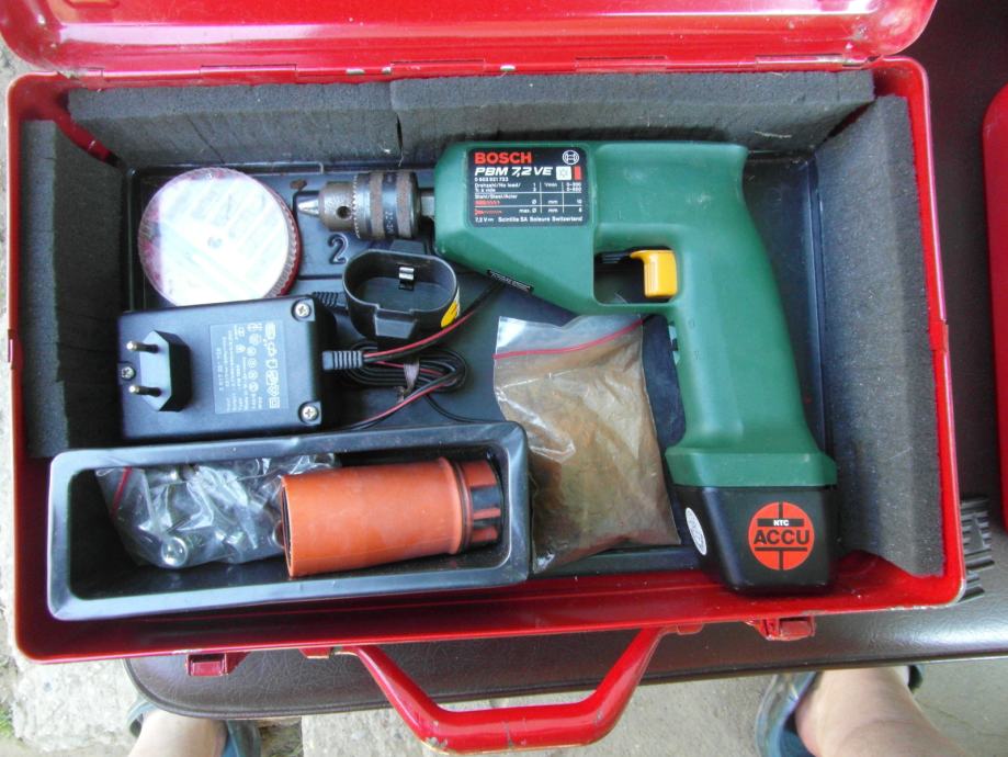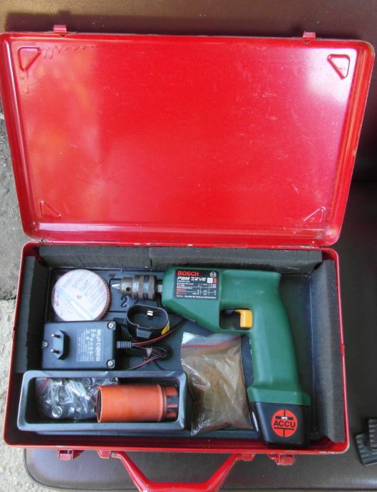 Bušilica u kuferu sa punjačem.Bušilica radi,baterija se može puniti,ali je slabija.S novom baterijom mislim da bi još dugo radila. U kompleu boreri i gedore nastavci.
