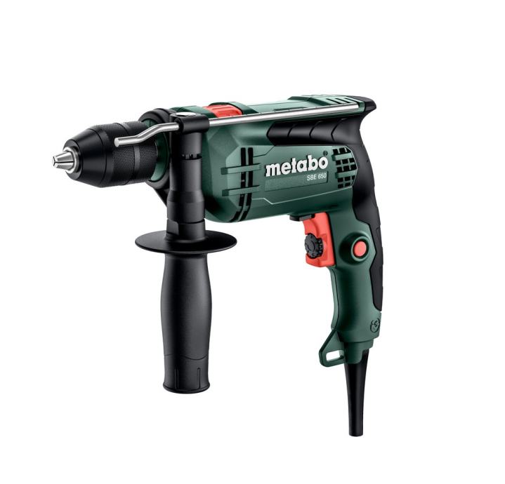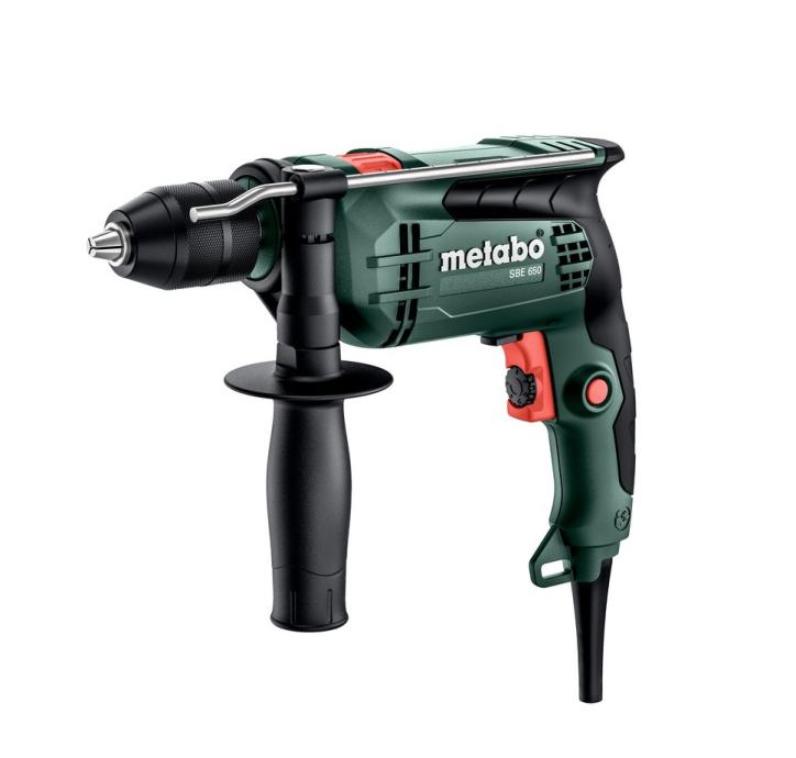 Udarna bušilica Metabo SBE 650 je namjenjena za bušenje u betonu, metalu i drvetu. Lagana i kompaktna, biti će dobar izbor za obavljanje poslova bušenja kod kuće ili na gradilištu. Vario (V)-elektronika za rad pri prilagođenim brzinama koje odgovaraju različitim materijalima. Regulacija broja okretaja moguća je preko kotačića na ručki. Brz prodor svrdla, dug radni vijek i snažan motor od 650 W. Vrtnja desno i lijevo je moguća s elektroničkom regulacijom i trajnom blokadom. Ručka s ugrađenim gumenim jastučićem. Bočna ručka s okretanjem 360 stupnjeva i graničnikom dubine.
