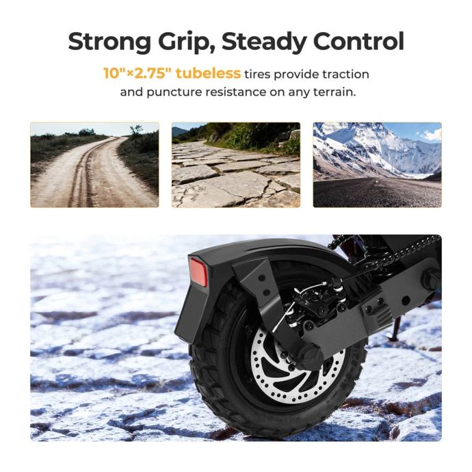 Što se tiče sigurnosti i udobnosti, L1 Max ne pravi kompromise - opremljen je naprednim swingarm sustavom ovjesa s podesivim oprugama na prednjim i stražnjim kotačima, 10×2.75-inčnim bezdušnim gumama s preporučenim tlakom od 50 PSI, te dvostrukim disk kočnicama (prednje i stražnje) u kombinaciji s E-ABS elektronskim sustavom protiv blokiranja kotača. Romobil može nositi do 130 kg tereta, penje se na nagibe do 20° (36.4%), a njegova široka platforma dimenzija 515×190 mm pruža stabilnost i udobnost pri vožnji.