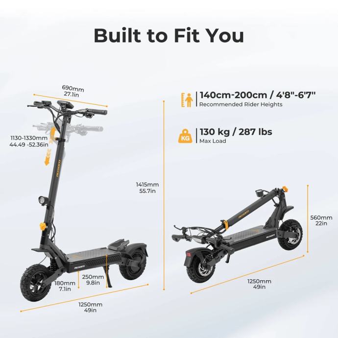 Tehnološki je iznimno napredan - posjeduje 4.5-inčni LCD zaslon koji prikazuje sve relevantne podatke, dvostruko otključavanje putem NFC kartice ili lozinke, pametno osvjetljenje koje uključuje prednja i stražnja svjetla, žmigavce te ambijentalno LED osvjetljenje za maksimalnu vidljivost i sigurnost tijekom noćne vožnje. Romobil se sklapa na kompaktnih 1250×690×560 mm što olakšava transport i skladištenje, a neto težina mu iznosi 29.7 kg uz vodootpornost razine IP54, što ga čini pouzdanim pratiteljem u gotovo svim vremenskim uvjetima.
