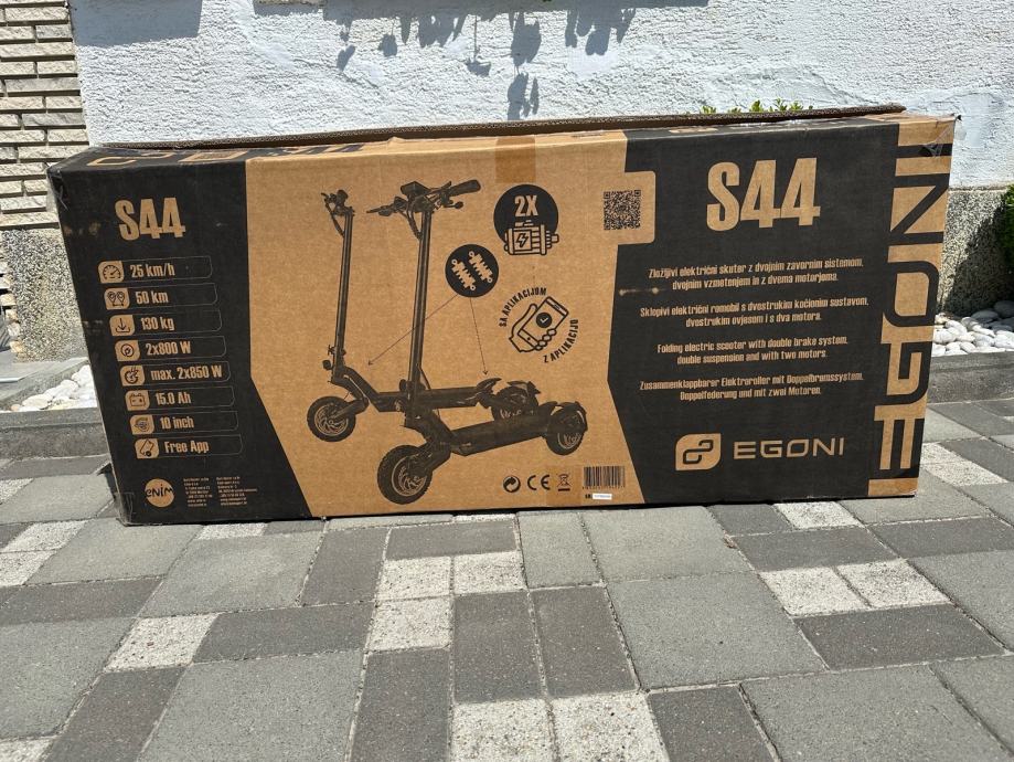Romobil E goni S44 pogon na oba kotača malo korišten očuvan , nove gume, prednja i zadnja suspenzija, max brzina 43 kmh, gume 10 Inc cijena 800eura, !HITNO!