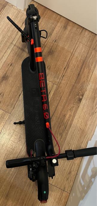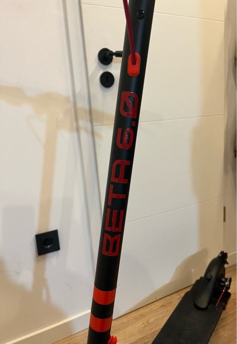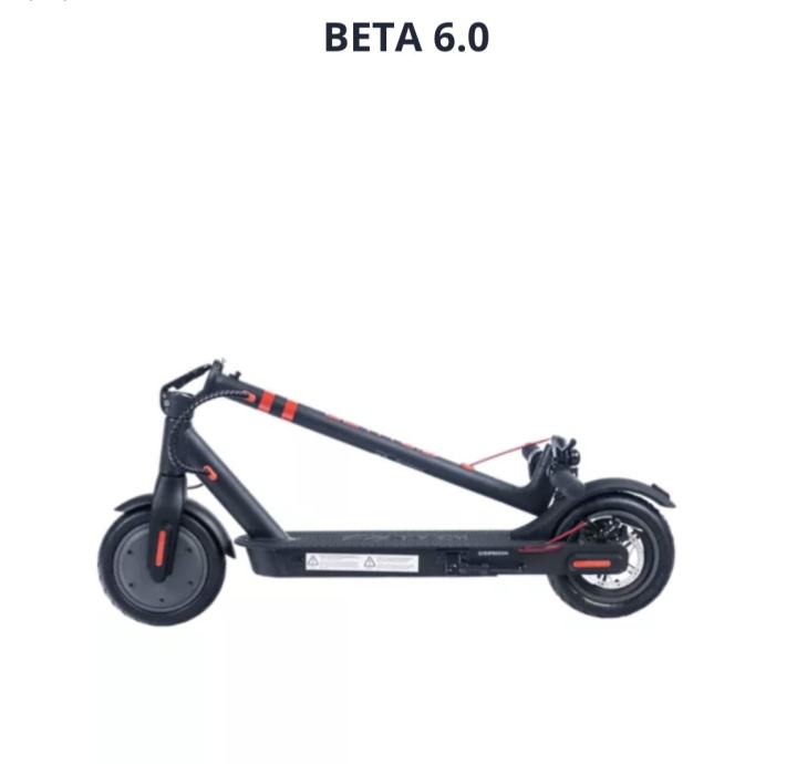 Prodajem električni romobil Beta 6.0 u crnoj boji s crvenim detaljima. Romobil je modernog dizajna s preklopivim sustavom za lakše prenošenje i pohranu. Ukupna težina paketa iznosi 4 kg što ga čini praktičnim za svakodnevno korištenje.