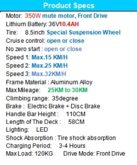 Zahvaljujući motoru od 350 W i litij-bateriji od 36 V od 10,4 Ah, autonomija može doseći 30 km, a maksimalna brzina je 32 km / h.