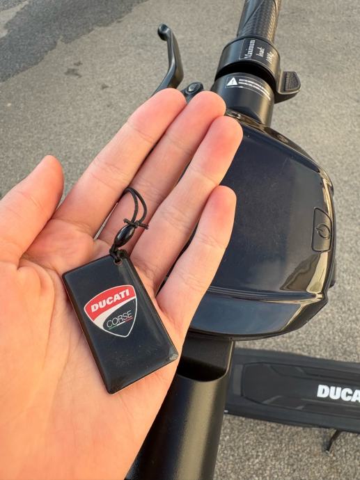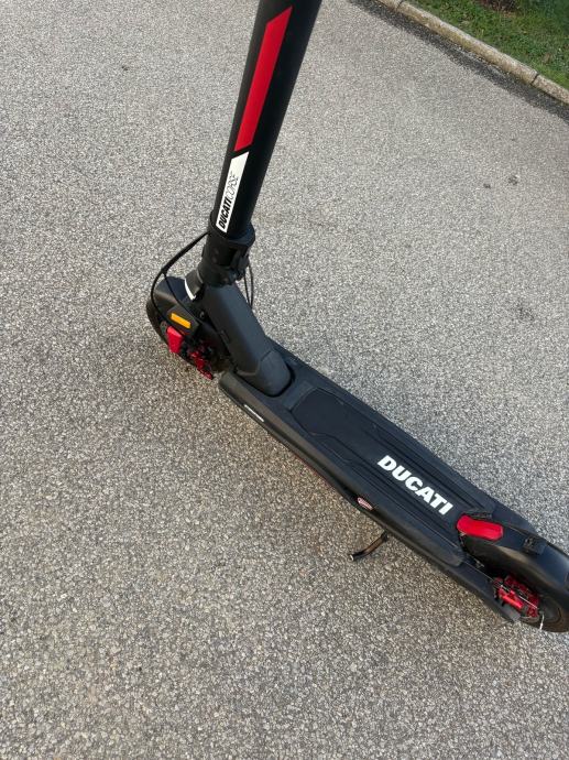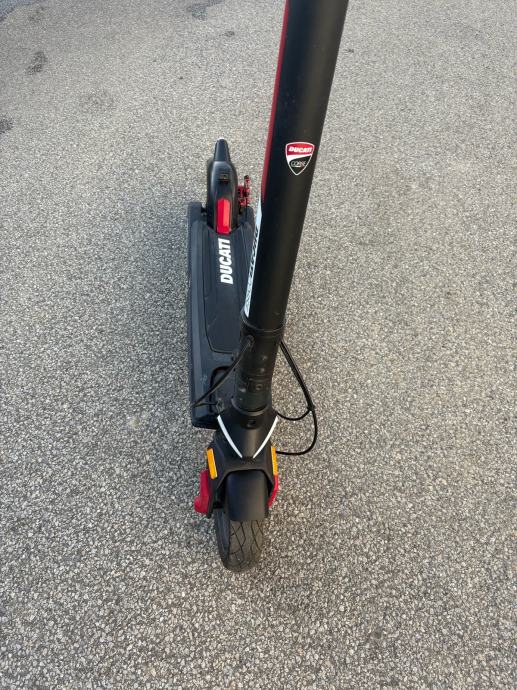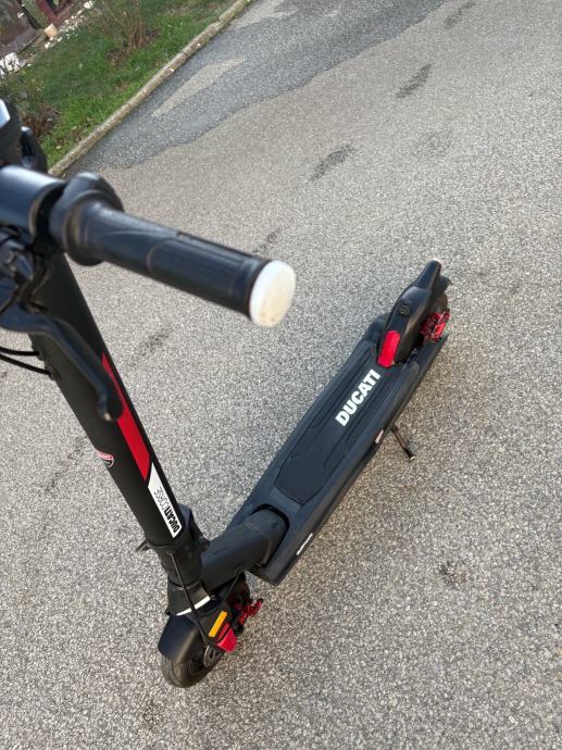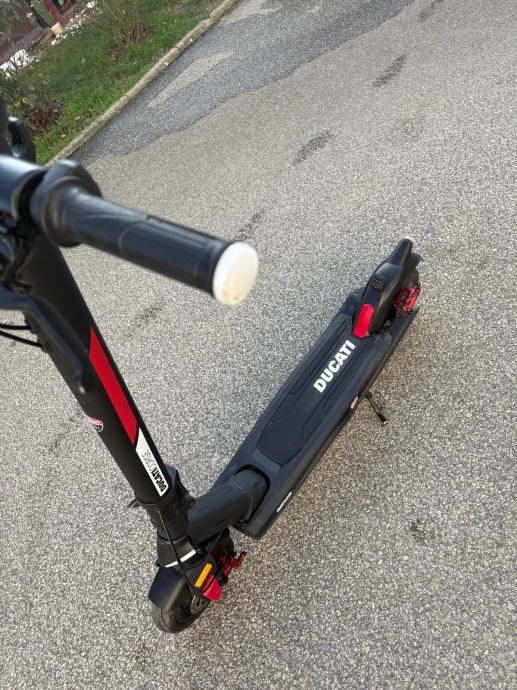 Prodajem rabljeni električni romobil Ducati Corse u crnoj boji s crvenim detaljima. Romobil dolazi s originalnim ključem. Konstrukcija je sklopiva, upravljač je ergonomski oblikovan s ručnom kočnicom, a platforma je niska i stabilna. Romobil je vizualno prepoznatljiv po Ducati logotipu i karakterističnom dizajnu brenda.
