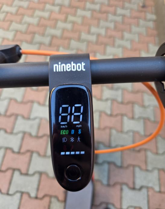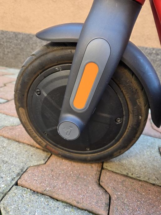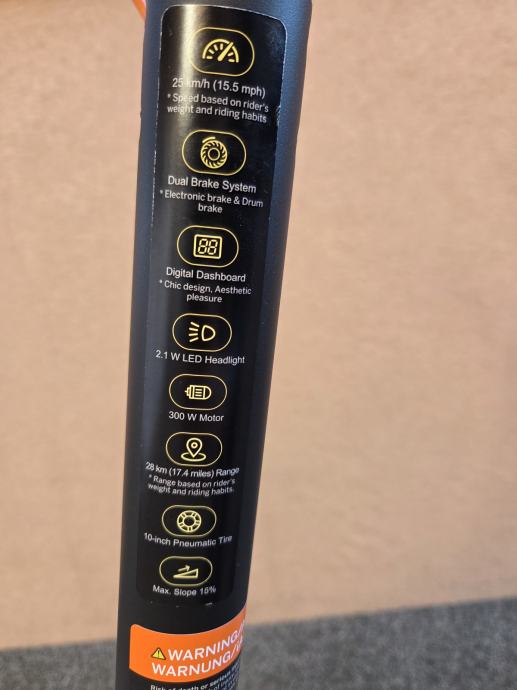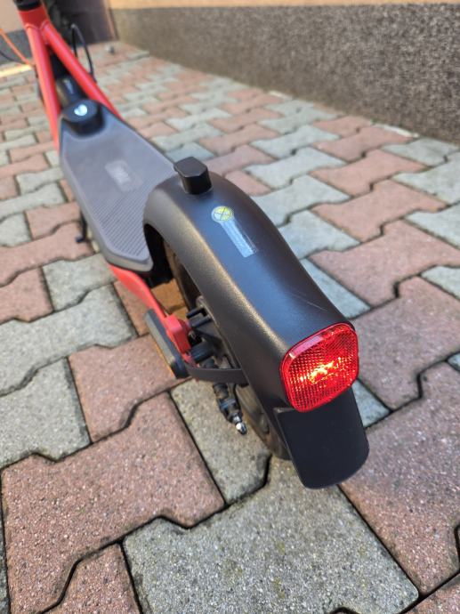 Romobil je u odličnom stanju, očuvan. Uz romobil dolazi i punjač. Može postići brzinu do 25 km na sat. S jednim punjenjem litij-ionske baterije maksimalni domet je 28 km. Ima 10-inčne gume, LED zaslon u boji, 4 načina vožnje i E-MARK prednja i stražnja sigurnosna svjetla. Motor snage 300 W, nosivost do 120 kg, romobil je moguće sklopiti.