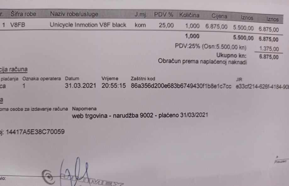 Izvrstan i kvalitetan monocikl. Prešao 680km. S njim ide račun i garancija, plus originalna kutija, punjač i knjiga/uputstva. Kupljen u HR, evozila.hr (cijena je 7.400kn). Idealan za početnike i napredne. Kupljen 31.3.2021. S njim se dobiju također dvije originalne zaštitne presvlake. U gumu je stavljena tekućina protiv bušenja.