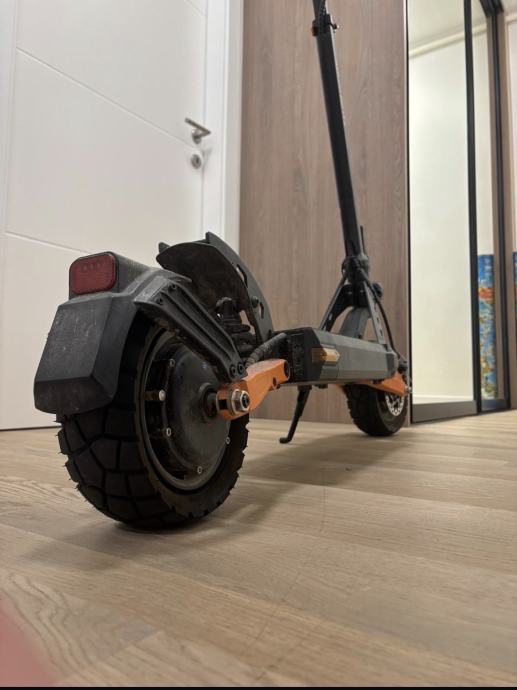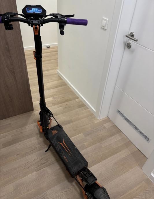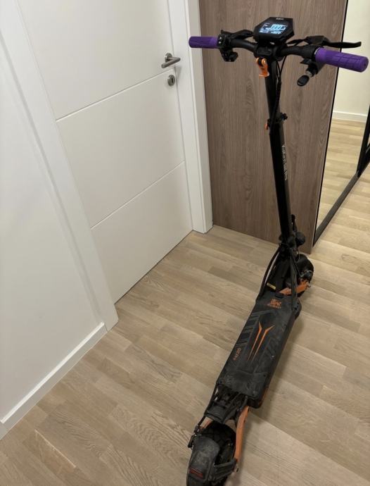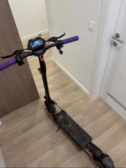 Prodajem električni romobil Kukirin G2 Pro. Radi se o robusnom romobilu crne boje s narančastim detaljima i ljubičastim ručkama. Opremljen je digitalnim LCD zaslonom koji prikazuje brzinu, razinu baterije i ostale podatke o vožnji. Romobil ima off-road gume pogodne za različite podloge te sklopivi okvir koji olakšava transport i skladištenje.