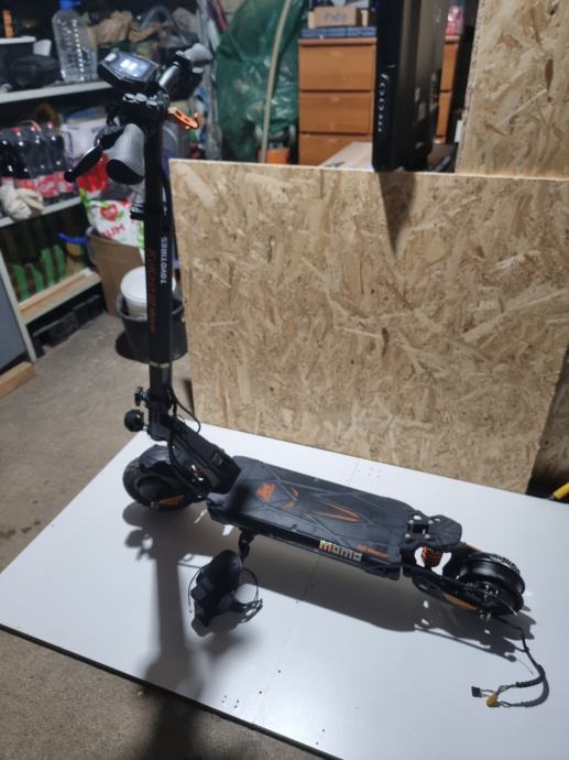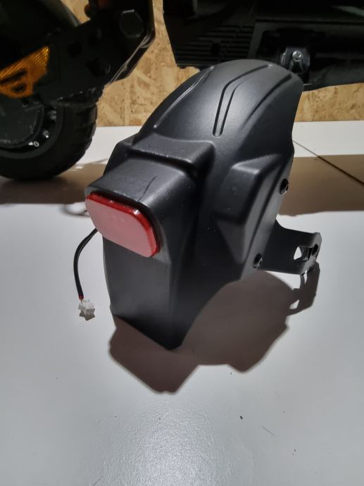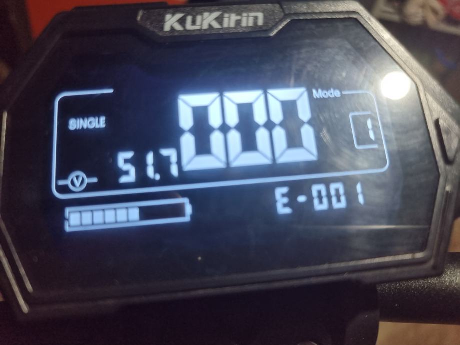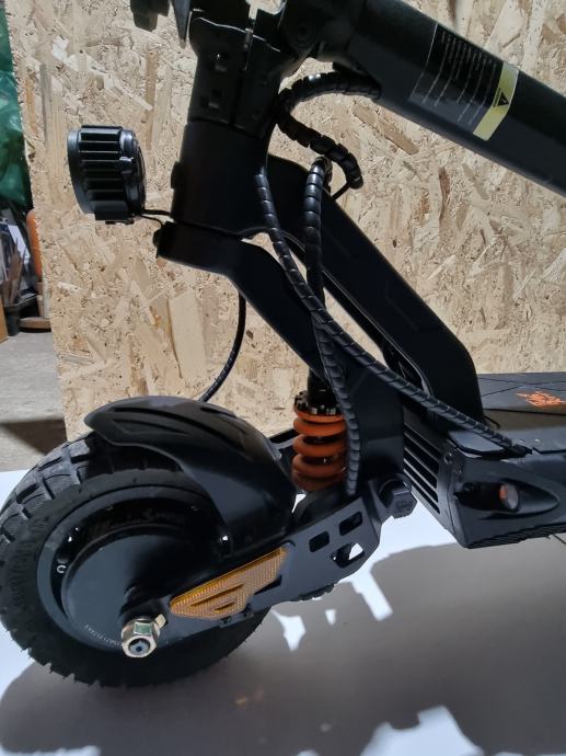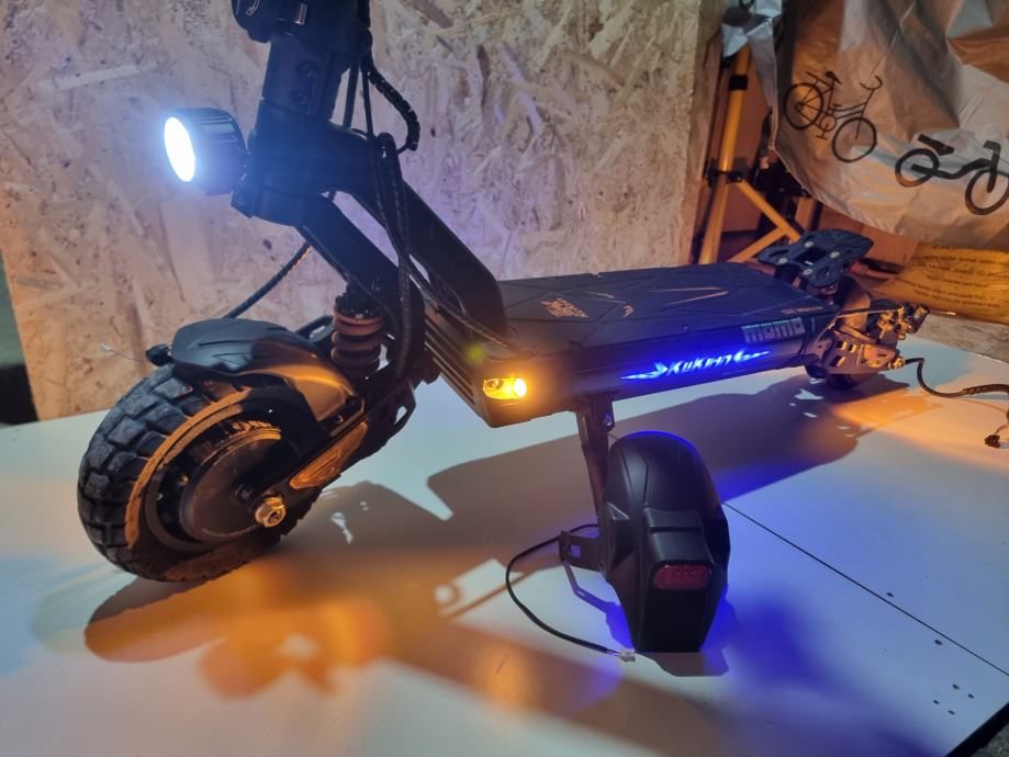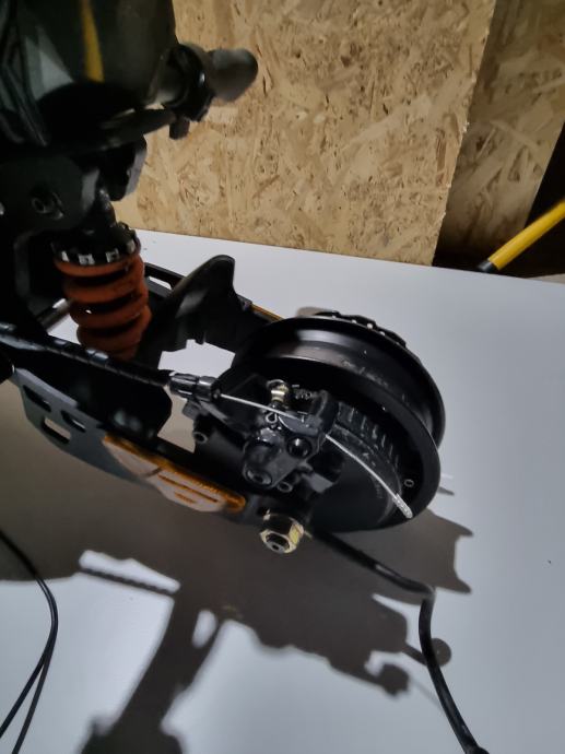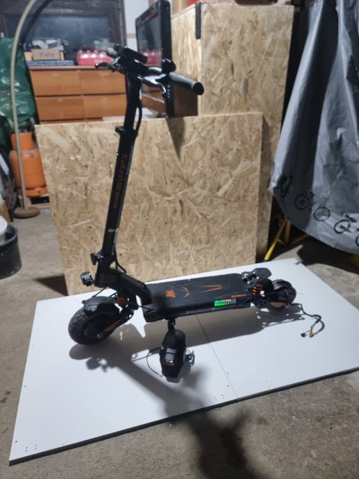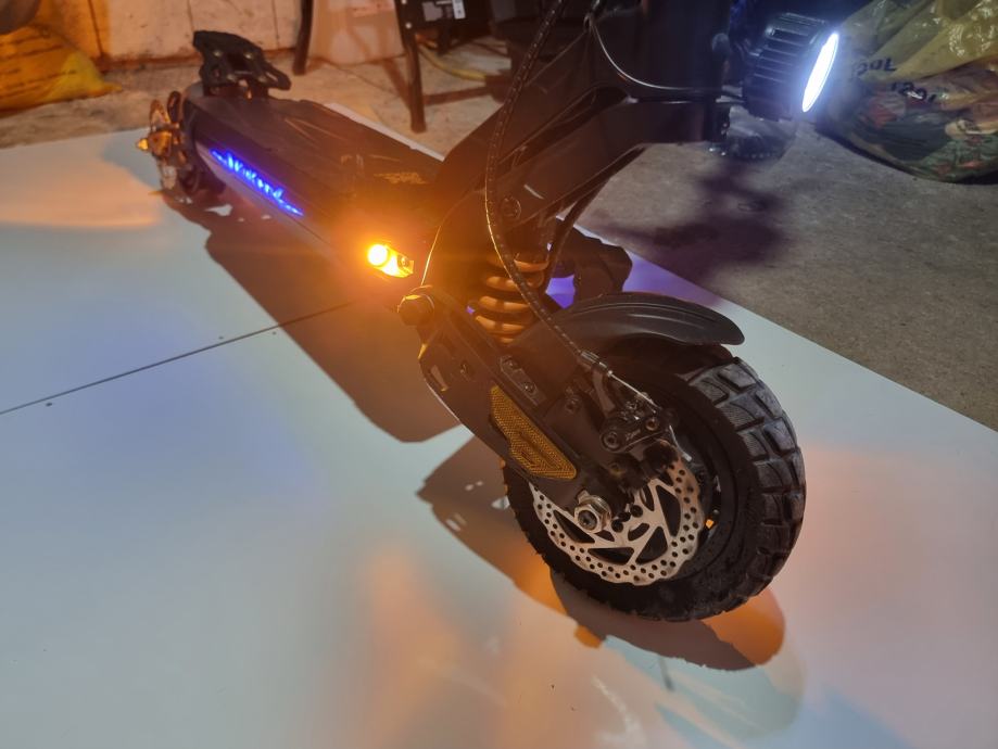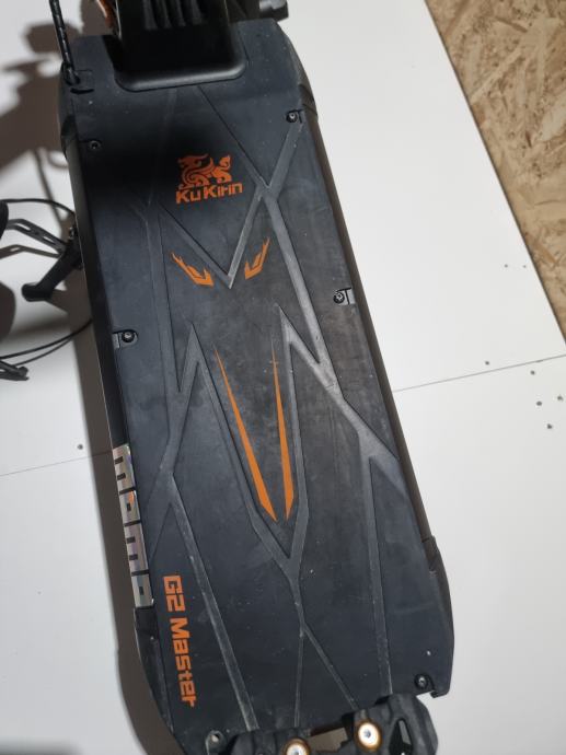 Prodajem elek. romobil kukurin g2 master u dobrom stanju, ima dva motora single da samo zadnji radi ili dual da oba dva rade motori od 1000w, max mu je 65km ima 3 moda na njemu radi sva svjetla , truba i žmigavci oba dva jedino sto se vidi na slici zadnja guma je podrapana pa sam ju skinul treba novu kupit inace se vozi normalno.Cijena nije fiksna